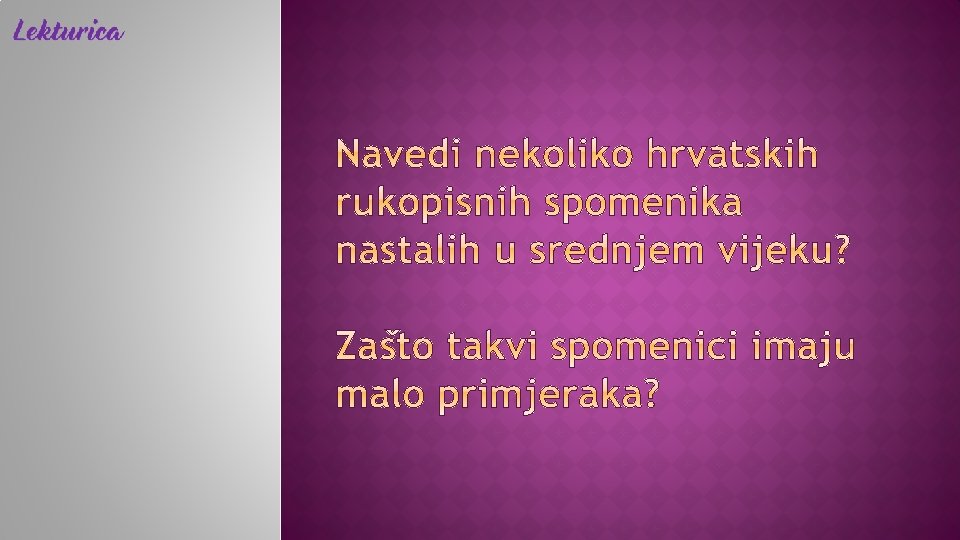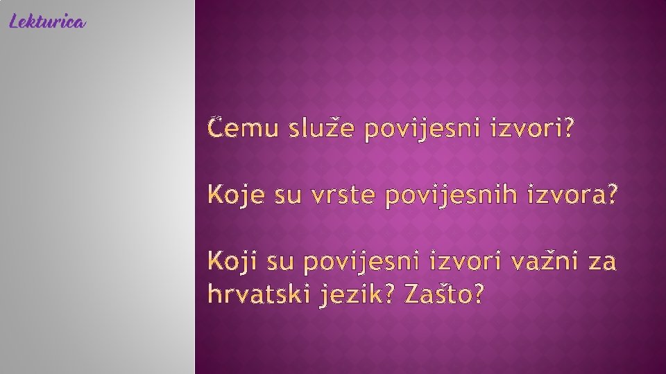 povijesni izvori − ostaci iz prošlosti vrste povijesnih izvora: materijalni, zvukovni, slikovni, pisani, usmena predaja prvi spomenici na hrvatskom jeziku − rani srednji vijek najstariji zapisi i tekstovi: klesani u kamenu (Bašćanska ploča) rukopisno zapisivani (Vinodolski zakonik, Povaljska listina, Šibenska molitva) tiskani (Misal po zakonu rimskoga dvora)