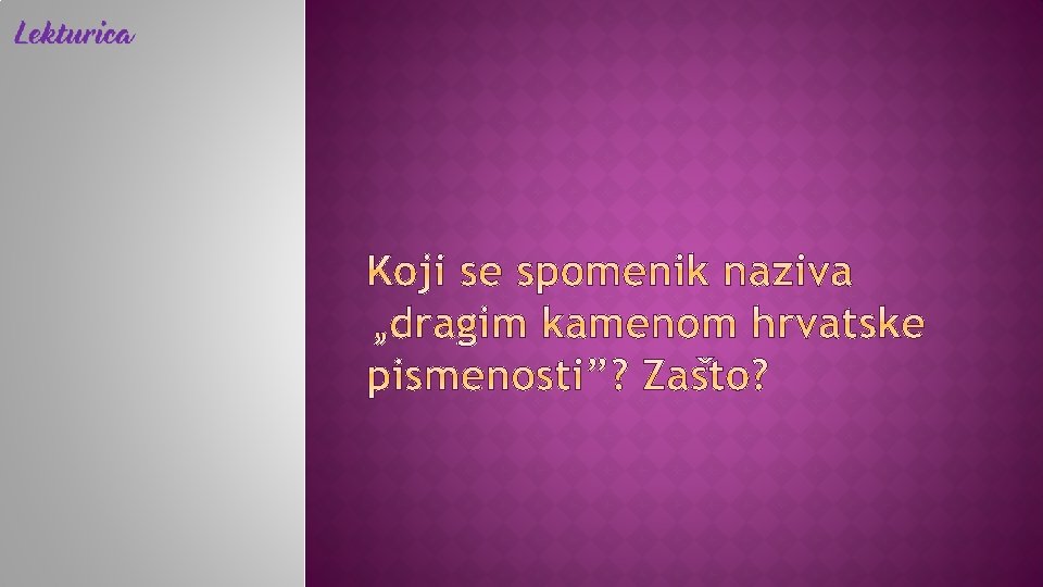 pismo: ćirilica jezik: hrvatsko-staroslavenski Povlja na otoku Braču − spomenik s nadvratnika (praga) opatije sv. Ivana Krstitelja čuva se u Muzeju hrvatskih arheoloških spomenika u Splitu ZAPIS: majstor Radonja na starokršćanskoj krstionici izradio je opatijska vrata, a knez Brečko podario je samostanu zemljišne posjede na otoku