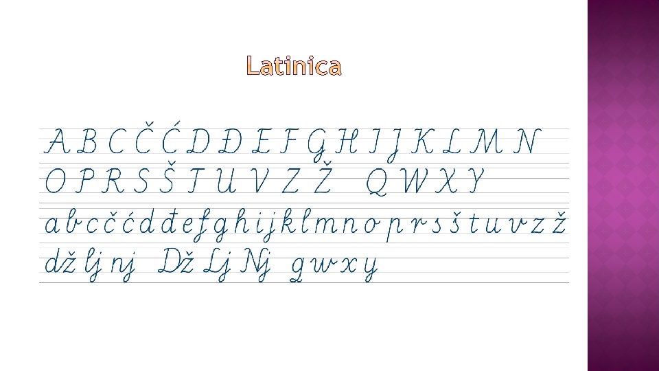 u početku − latinicom su zapisivani tekstovi na latinskom j. 14. st. − upotreba latinice kao hrvatskog pisma prilagodba latinice glasovnom sustavu hrvatskoga jezika: č, ć, dž, đ, lj, nj, š, ž težnja da se uspostavi odnos jedan glas − jedan znak ujednačavanje slovopisa − tek u 19. st.