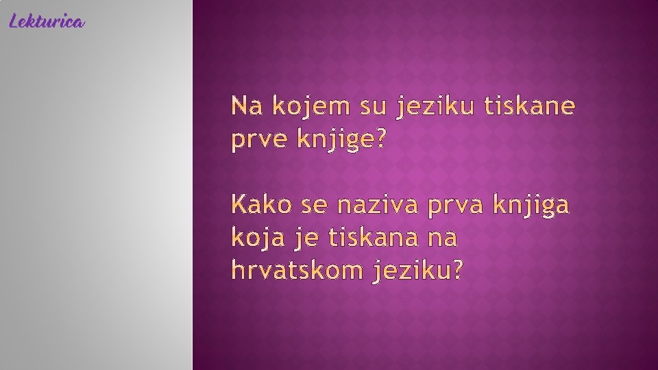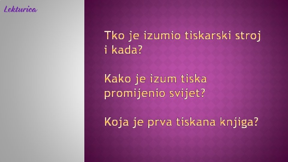 Johannes Gutenberg prva tiskana knjiga: Biblija (Mainz, 1455. ) − latinski jezik tiskanje knjiga → brže i jeftinije knjiga dostupnija većem broju korisnika prve tiskane knjige − inkunabule HRVATSKE TISKARE: kraj 15. i poč. 16. st. Kosinj, Senj, Rijeka