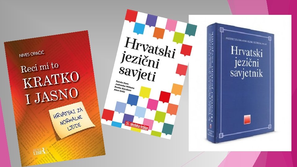 JEZIKOSLOVLJE ili LINGVISTIKA v znanost koja proučava jezik v jezikoslovci stvaraju jezične priručnike kojima opisuju STANDARDNI, KNJIŽEVNI JEZIK v JEZIČNI PRIRUČNICI: Ø rječnici svaki od priručnika Ø gramatike obrađuje poseban dio Ø pravopisi jezika, tj. određen Ø jezični skup pravila savjetnici