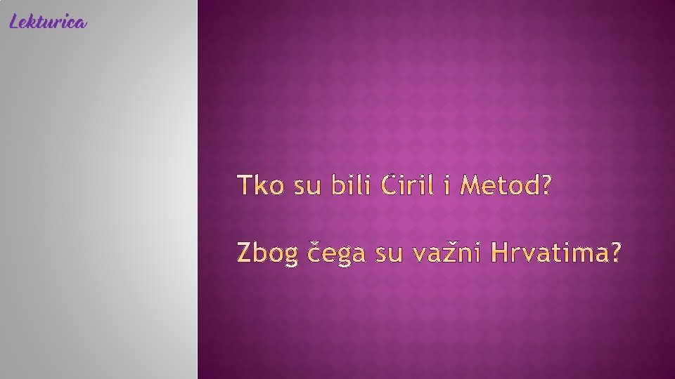Sveta braća, Solunska braća, Slavenski apostoli sinovi bizantskog zapovjednika Leona rođeni u Solunu (grad Tesaloniki u Grčkoj) Solun je od kraja 6. st. bio okružen Slavenima braća su uz grčki govorila i slavenski jezik → 862. g. moravski knez Rastislav šalje Carigradu molbu da Moravskoj pošalje biskupa i svećenike koji će na slavenskom jeziku propovijedati kršćanstvo − odabrani Ćiril i Metod da bi misija bila uspješna, Ćiril je za Slavene sastavio posebno pismo − (oblu) glagoljicu i preveo najnužnije knjige