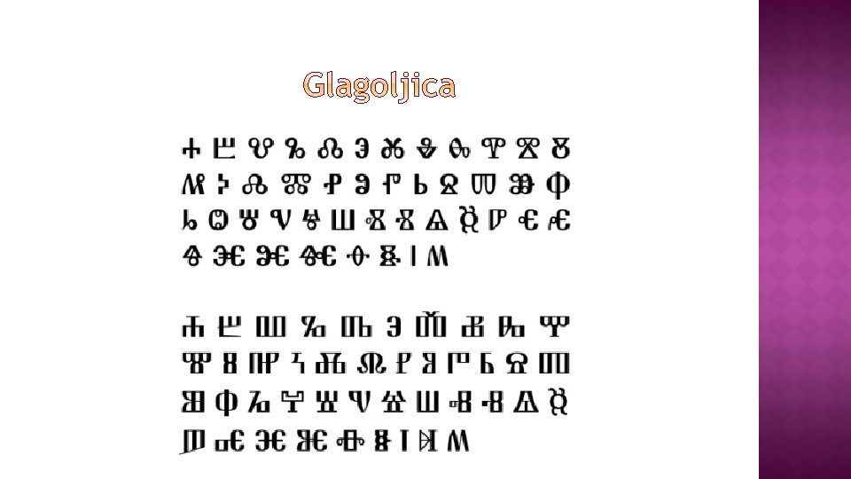 9. st. − u hrvatske krajeve dolaze učenici Ćirila i Metoda, donose knjige pisane općeslavenskim jezikom i glagoljicom Hrvati prihvaćaju taj jezik i pismo (jer im je bio bliži i razumljiviji od latinskoga) općeslavenski → unošenje sve više značajki hrvatskih narodnih govora → starohrvatski s obilježjima hrv. narječja glagoljica → hrvatska varijanta: uglata glagoljica