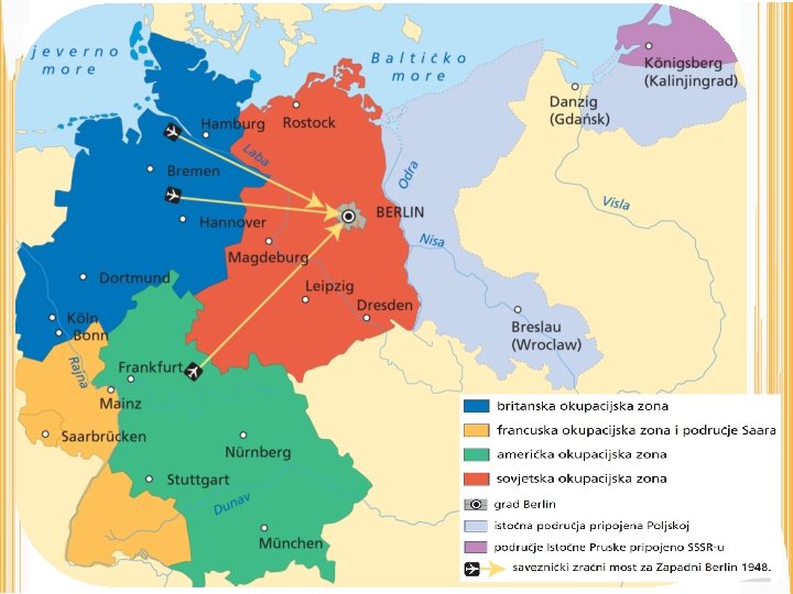 ožujak 1948. Saveznici odlučili ujediniti svoja tri okupacijska područja SSSR uveo blokadu Berlina Velika Britanija i SAD uspostavili zračni koridor za opskrbu stanovnika – sovjetska blokada propala posljedica – pojačano naoružavanje obje strane