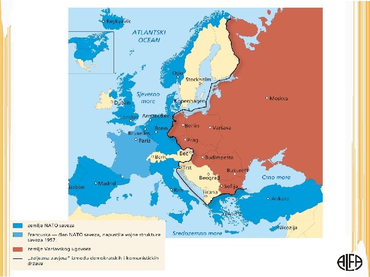 HLADNI RAT I BLOKOVSKA PODJELA SVIJETA Hladni rat – napetost bez sukoba između velikih sila blokovi vojno–politički savezi SAD 1949. - NATO (demokratske države) SSSR 1955. - Varšavski ugovor (socijalističke države) željezna zavjesa 1961. izgrađen Berlinski zid
