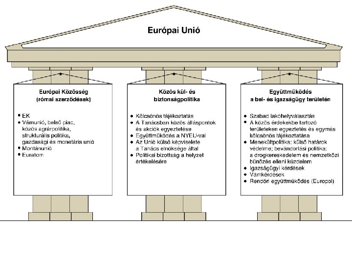 Az EU létrejötte 1958 Római Szerződések: Az Európai Gazdasági Közösség (Közös Piac) Az Európai Atomenergia-közösséget létrehozó szerződés 1952 Az Európai Szén- és Acélközösség hat állam – NSZK, Franciaország, Olaszország, Hollandia, Belgium és Luxemburg 1992 Maastrichti Szerződés: Szerződés az Európai Unióról az európai valuta bevezetése (pénzunió terve) 2002. 12 tagállam bevezette közös kül- és biztonságpolitika kialakítása egységes vízumpolitika életbeléptetése a közös intézmények – az Európa Parlament és Európai Bizottság – szerepének kiszélesítés az EK elnevezése Európai Unióvá (EU) változott, 2007 Lisszaboni Szerződés (aláírva, ratifikálásra vár) 1995 2003 2004 Nizzai Szerződés 10 új állam, közte Magyarország csatlakozása Schengeni egyezmény az unió tagállamai között „lebontotta a határokat” (személyi ellenőrzés sincs), viszont a külső határokon szigorúbb ellenőrzést írt elő i