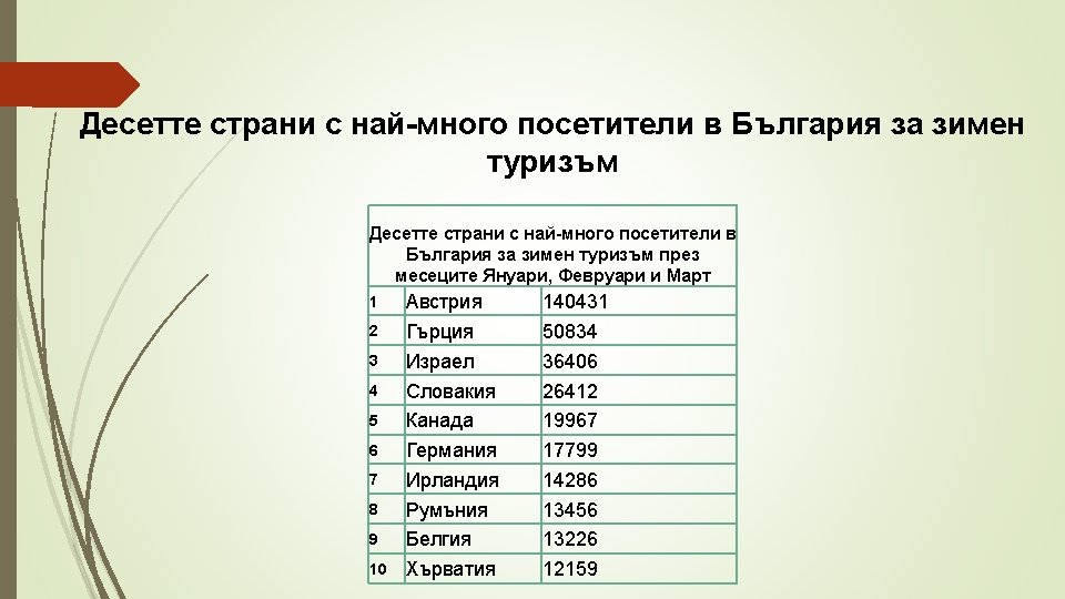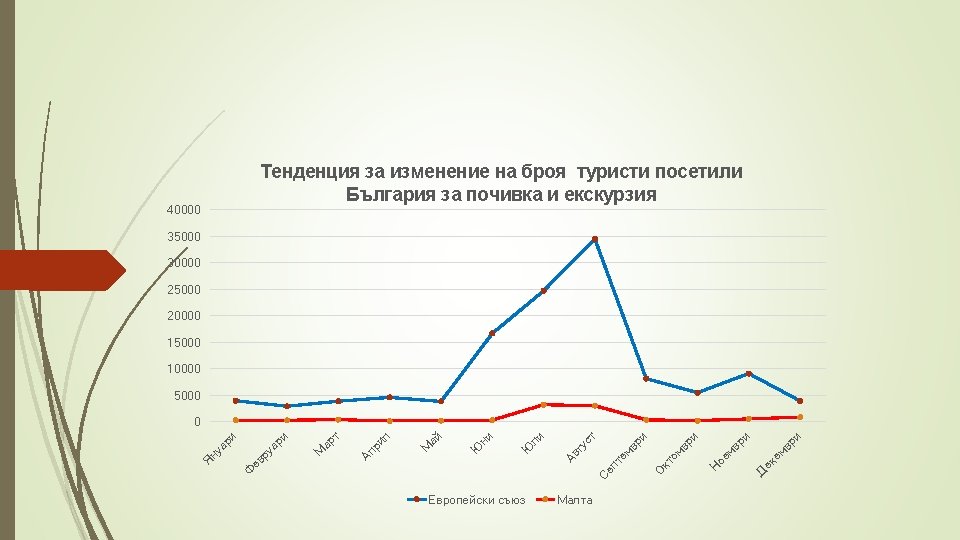 Месец Общ брой туристи от ЕС Среден брой туристи от ЕС Туристи от Малта Януари 79368 3968 311 Февруари 58584 2929 284 Март 77563 3878 416 Април 91938 4597 125 Май 76648 3832 183 Юни 333255 16663 317 Юли 493913 24696 3214 Август 688979 34449 3027 Септември 162693 8135 367 Октомври 109794 5490 214 Ноември 182042 9102 544 Декември 78491 3925 870