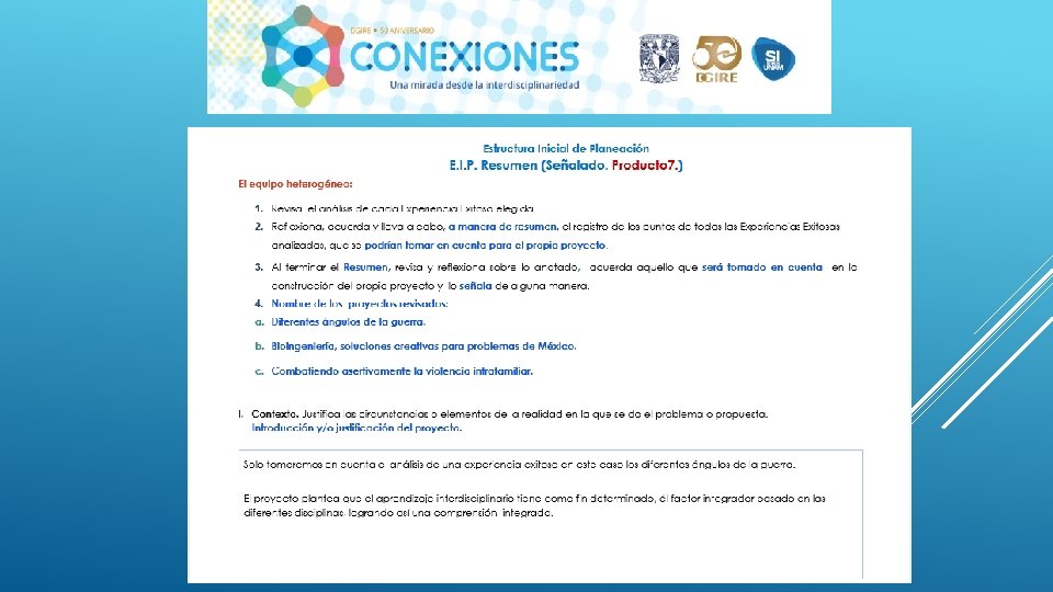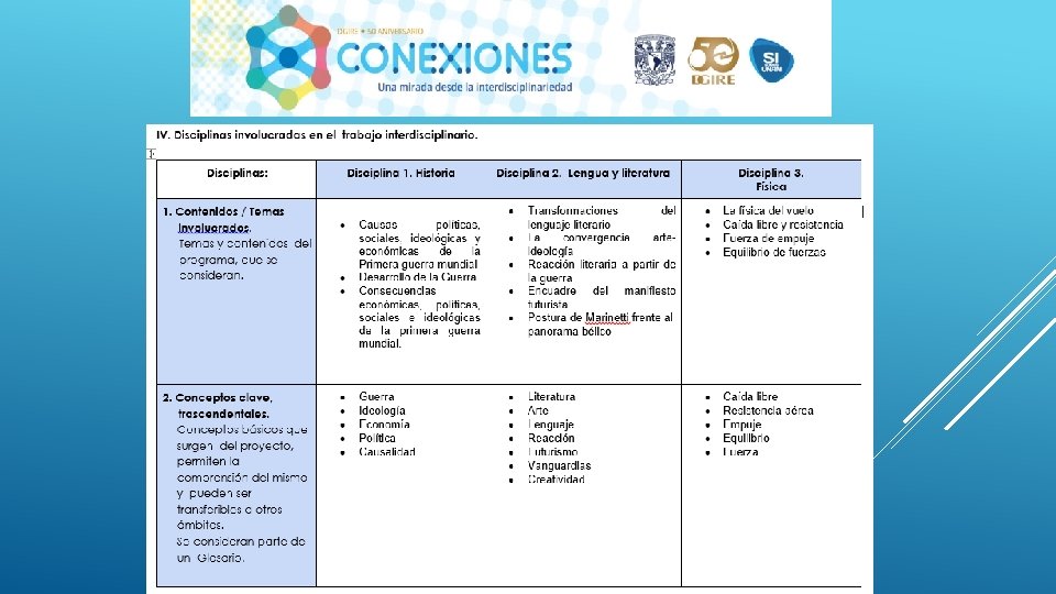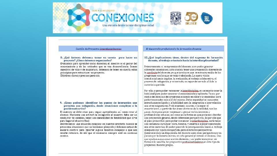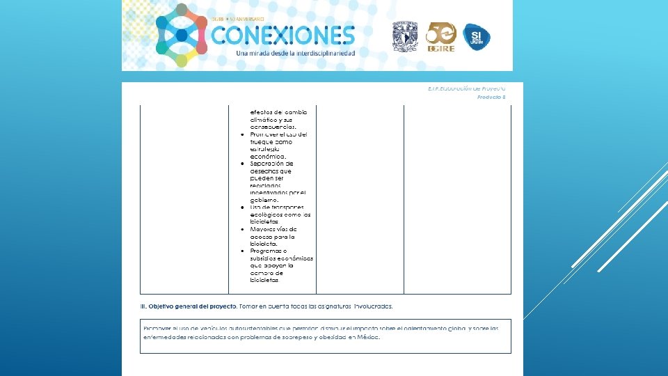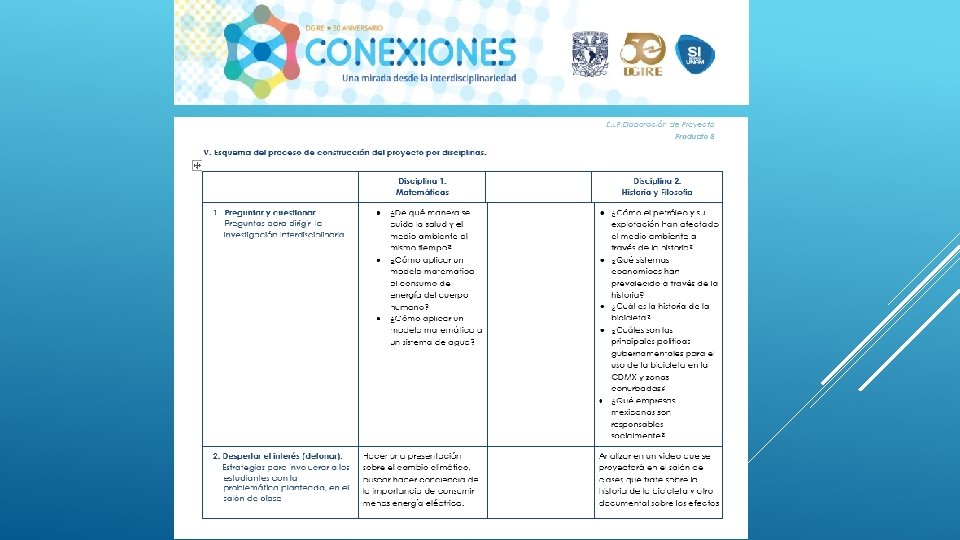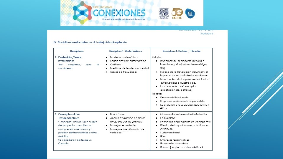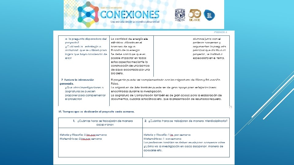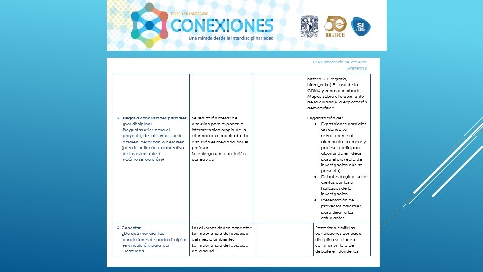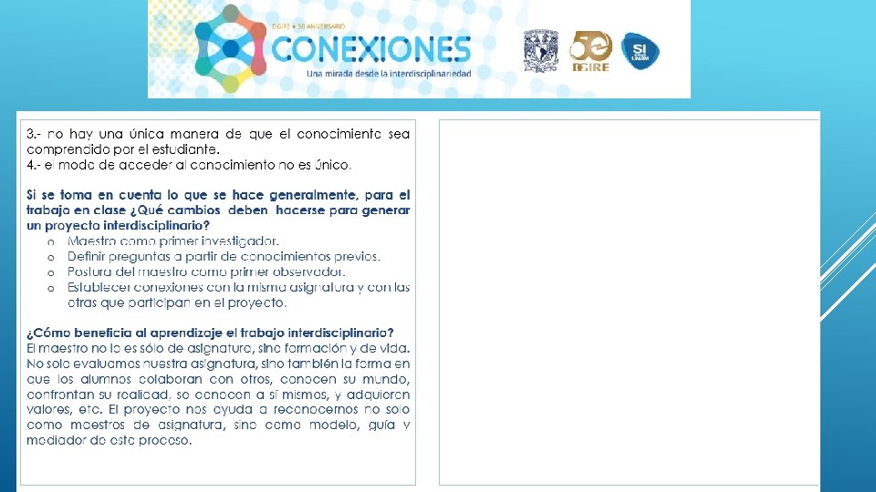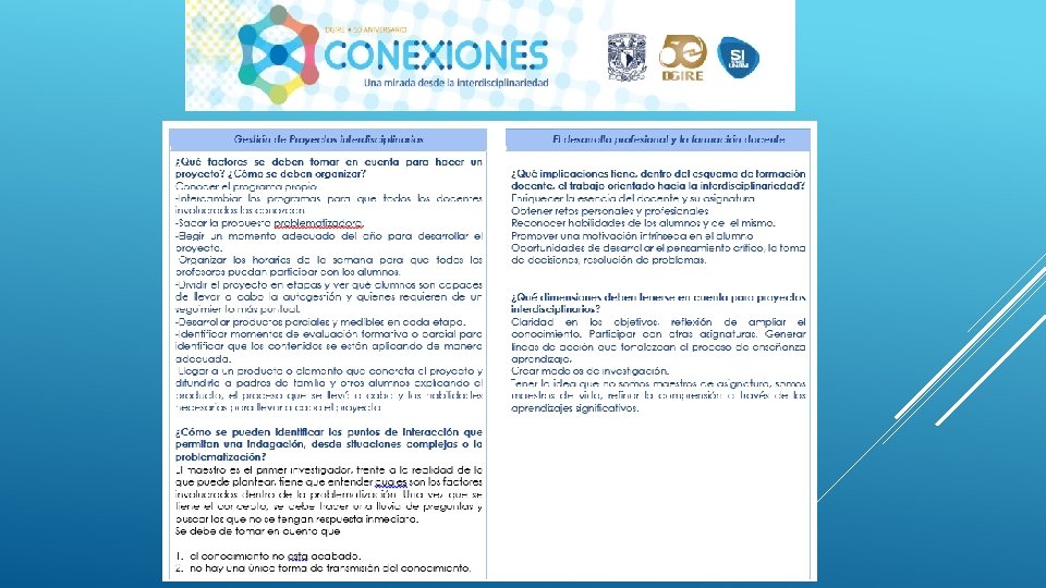 En general el Proyecto “CONEXIONES” como su nombre lo dice ayuda a conectar distintas disciplinas en este caso educativas, sin duda alguna se necesita tener este tipo de proyectos interdisciplinarios para que en el proceso de Enseñanza-Aprendizaje podamos contribuir a la formación de nuestros alumnos de una manera integral, considerando en primer lugar los programas y planes. Nos queda claro que el Profesor deberá conocer y dominar los contenidos de su programa, a su vez también tendrá la necesidad de conocer de manera general las demás materias y con ello realizar proyectos que puedan integrar la visión de las distintas áreas que integran un proyecto interdisciplinario, y con ello generar el trabajo cooperativo tanto de profesores como de alumnos. Es importante también tomar en cuenta que la interdisciplinariedad tiene como misión generar en los alumnos una actitud socioconductivista, en donde el alumnos pueda llegar a generar su propio conocimiento y que considere la aplicación que tiene cada uno de los proyectos en su vida diaria. La interdisciplinariedad es una vía para la mejora continua en el Proceso Enseñanza-Aprendizaje, ya que te permite innovar y hacer más atractivo cada uno de los conocimientos vistos en clase.