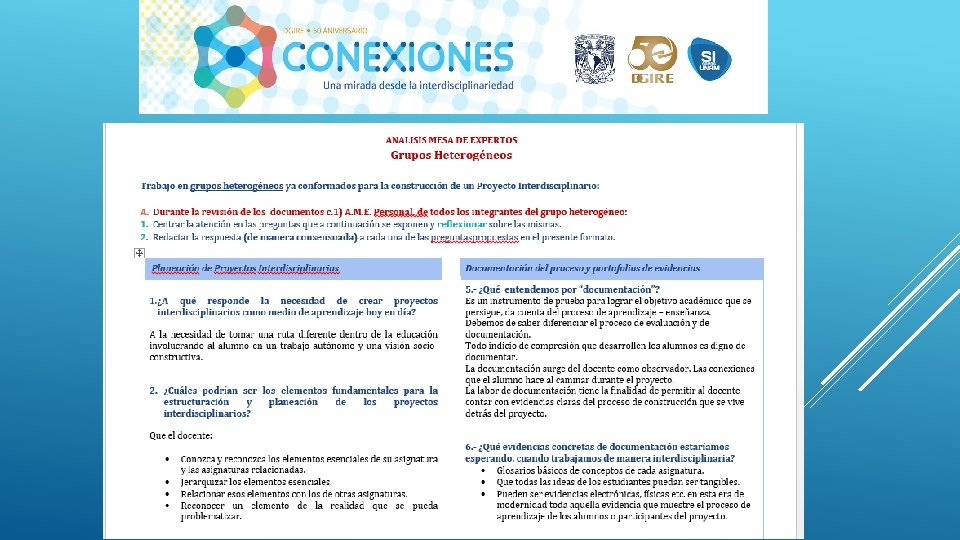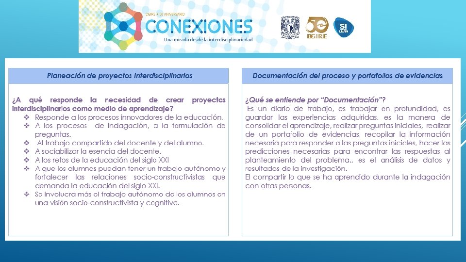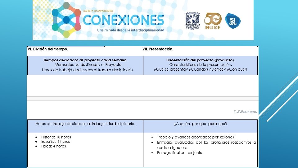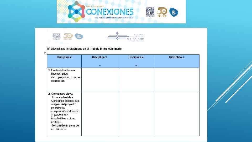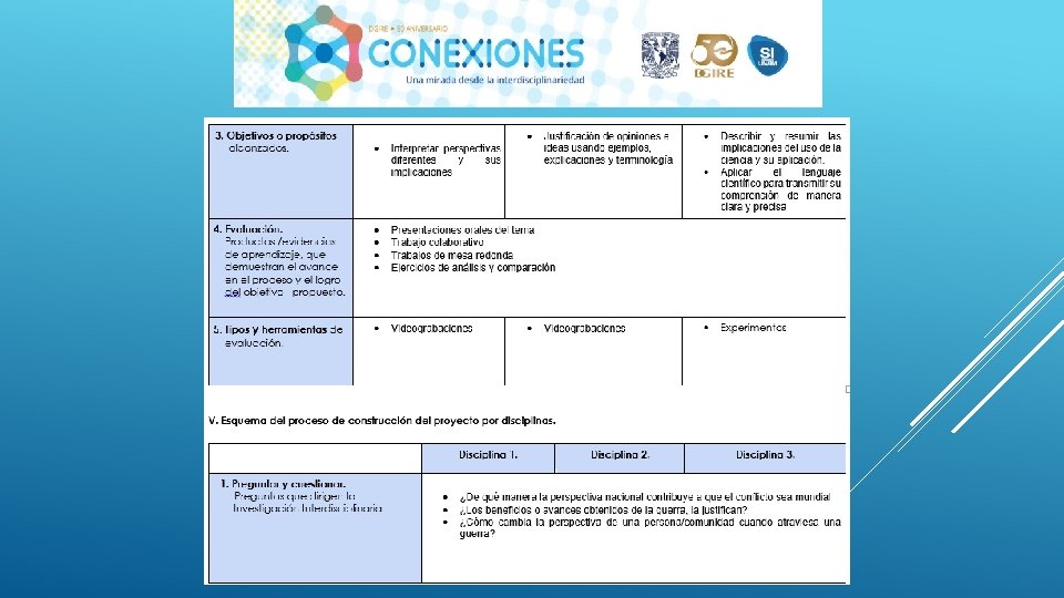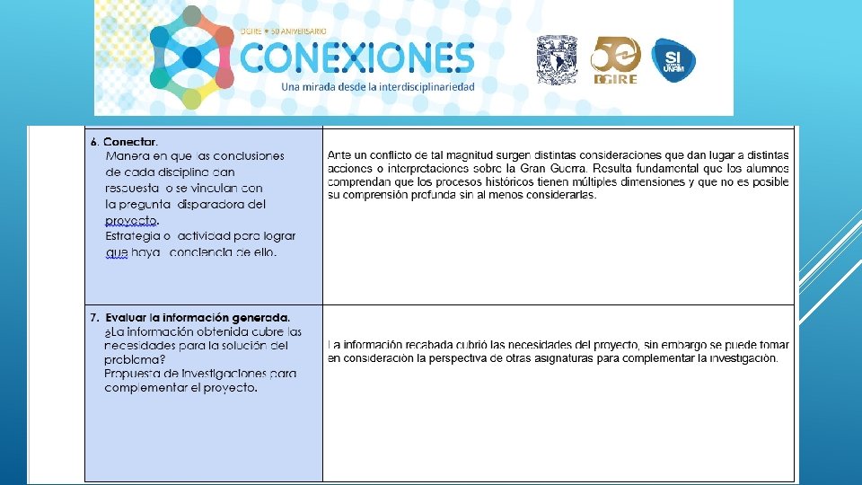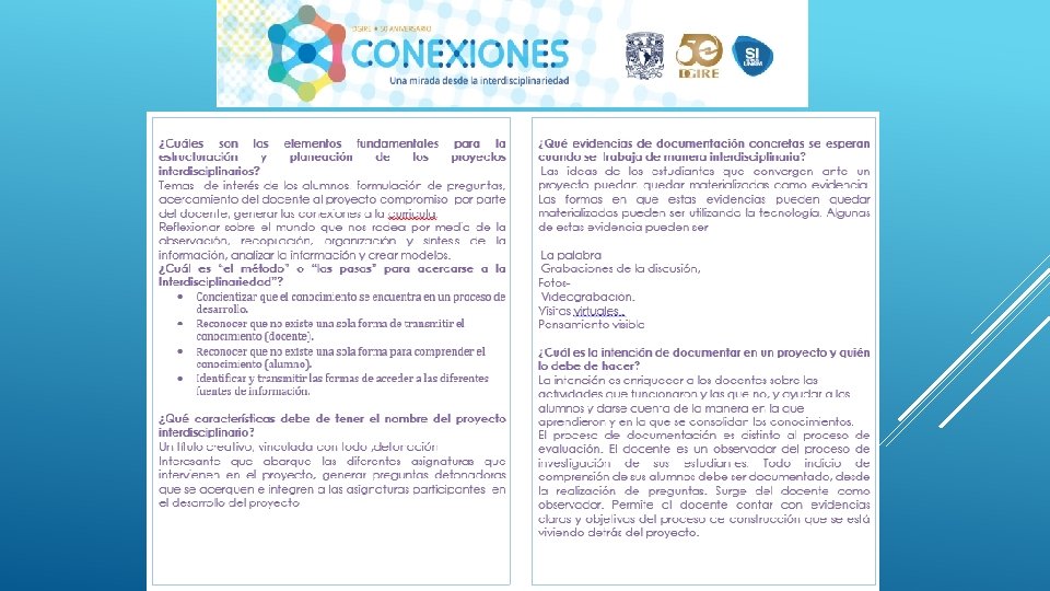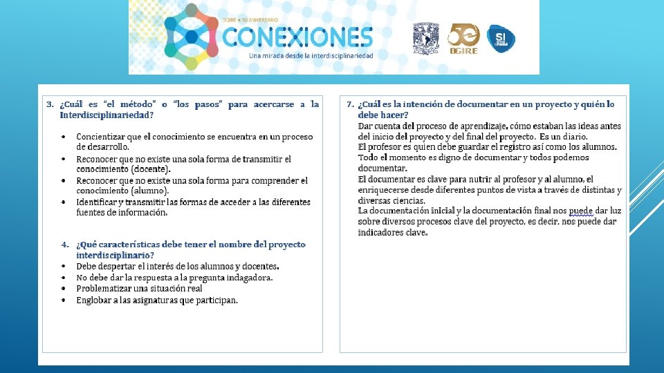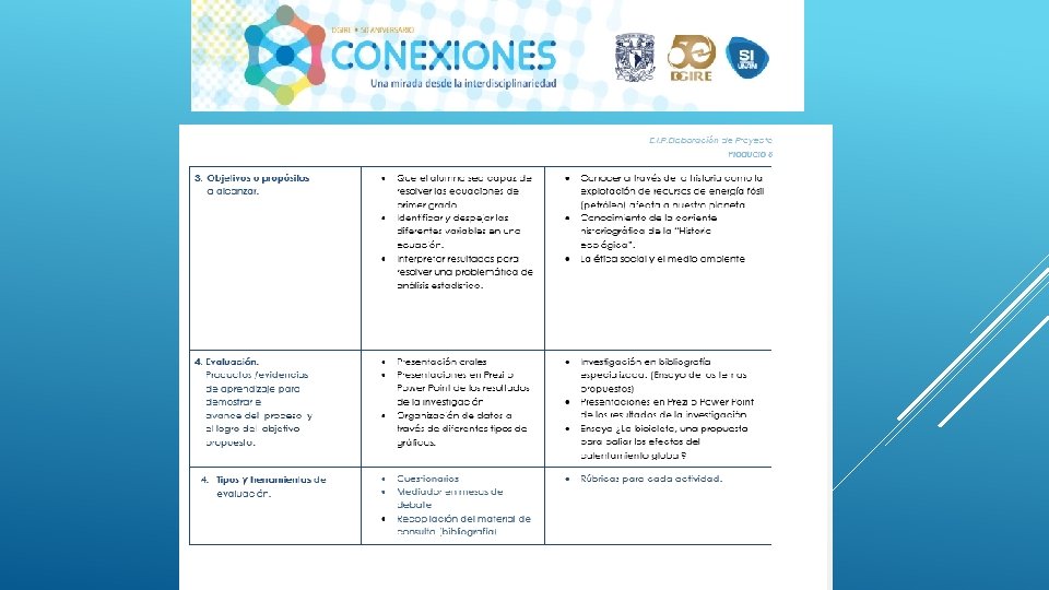 En general el Proyecto “CONEXIONES” como su nombre lo dice ayuda a conectar distintas disciplinas en este caso educativas, sin duda alguna se necesita tener este tipo de proyectos interdisciplinarios para que en el proceso de Enseñanza-Aprendizaje podamos contribuir a la formación de nuestros alumnos de una manera integral, considerando en primer lugar los programas y planes. Nos queda claro que el Profesor deberá conocer y dominar los contenidos de su programa, a su vez también tendrá la necesidad de conocer de manera general las demás materias y con ello realizar proyectos que puedan integrar la visión de las distintas áreas que integran un proyecto interdisciplinario, y con ello generar el trabajo cooperativo tanto de profesores como de alumnos. Es importante también tomar en cuenta que la interdisciplinariedad tiene como misión generar en los alumnos una actitud socioconductivista, en donde el alumnos pueda llegar a generar su propio conocimiento y que considere la aplicación que tiene cada uno de los proyectos en su vida diaria. La interdisciplinariedad es una vía para la mejora continua en el Proceso Enseñanza-Aprendizaje, ya que te permite innovar y hacer más atractivo cada uno de los conocimientos vistos en clase.