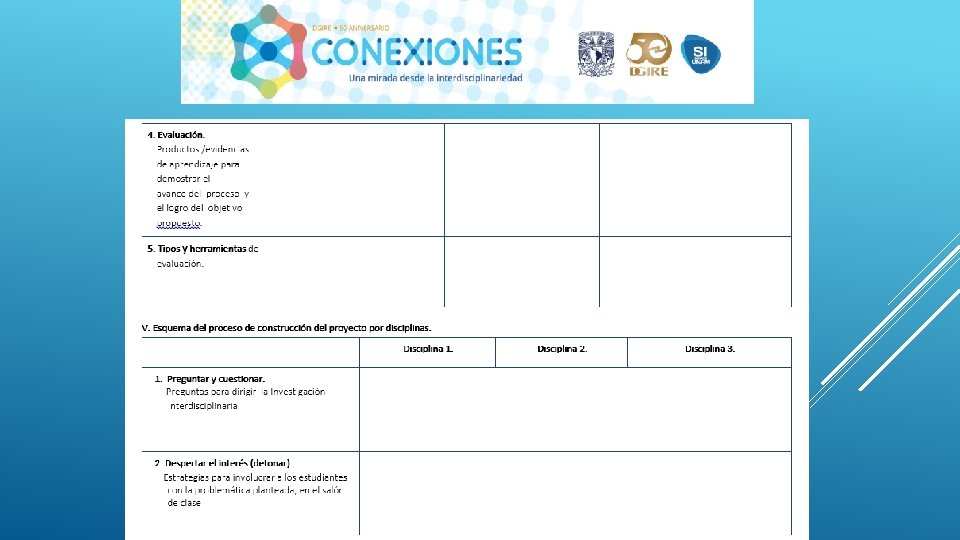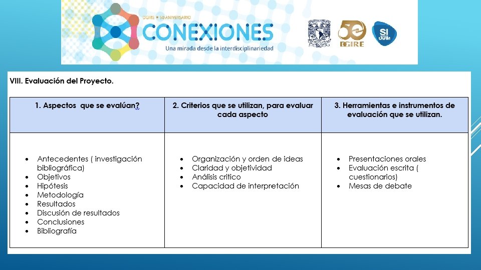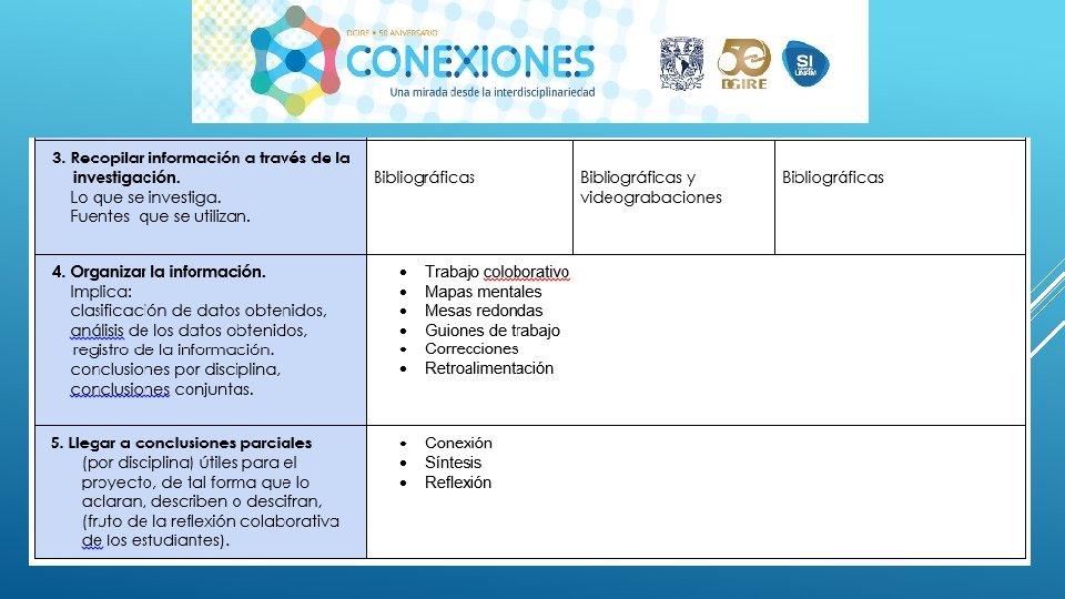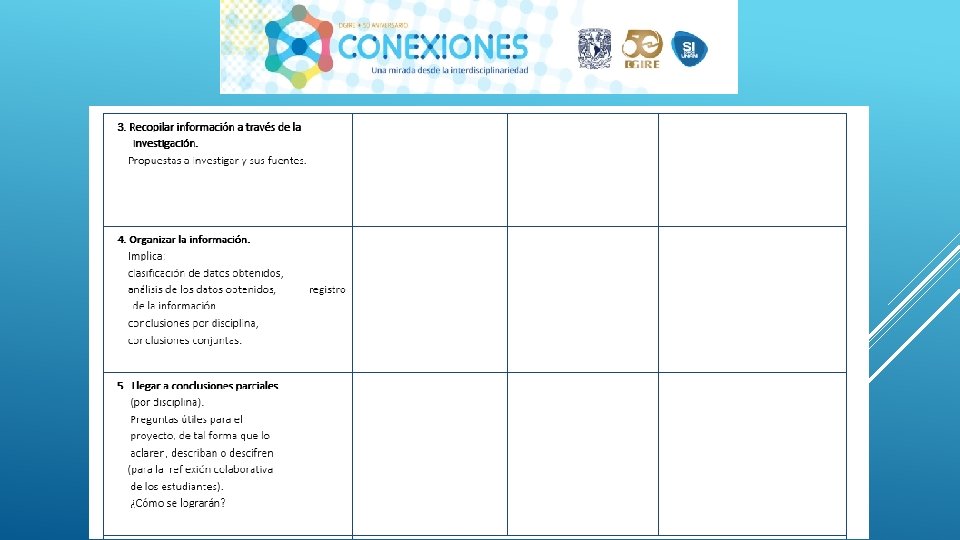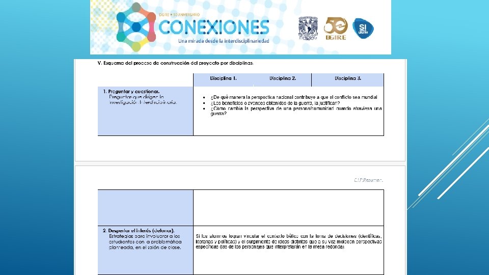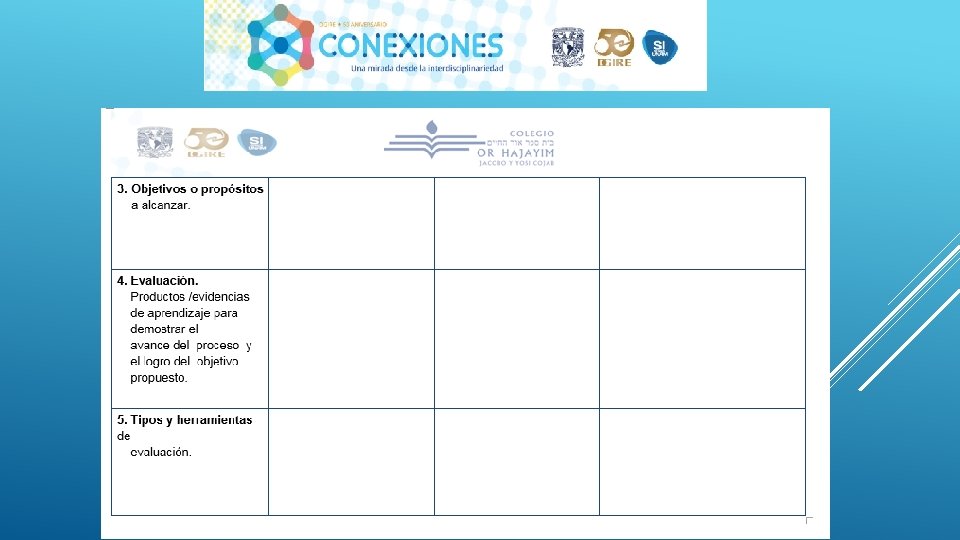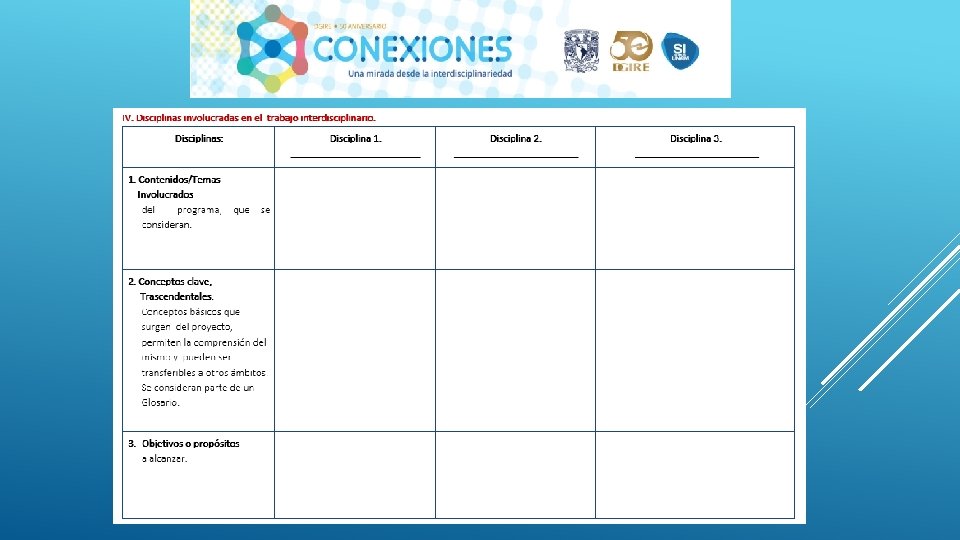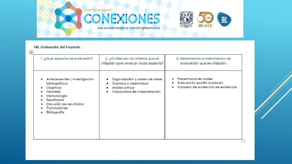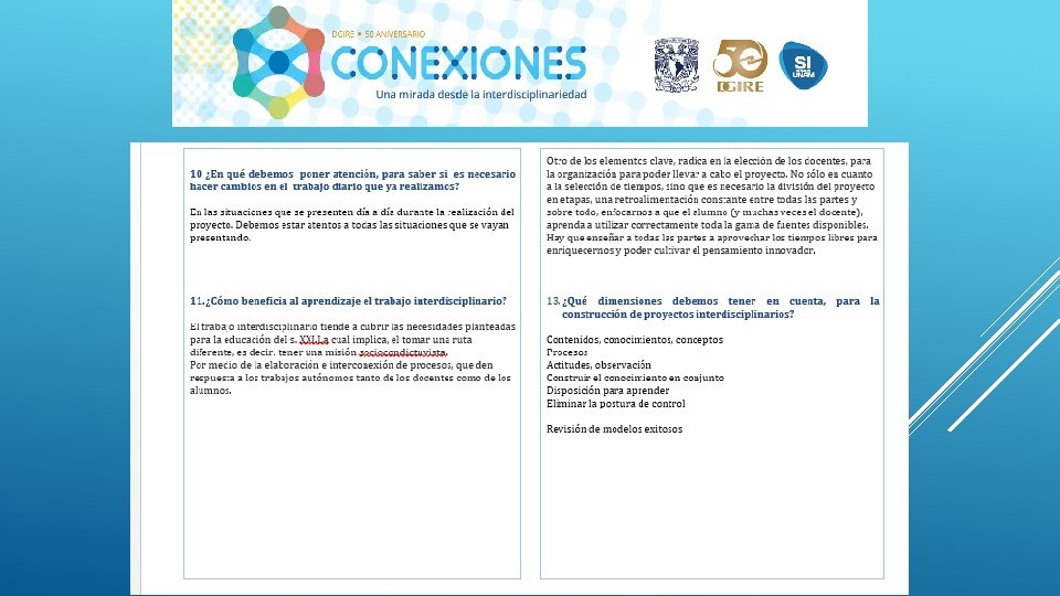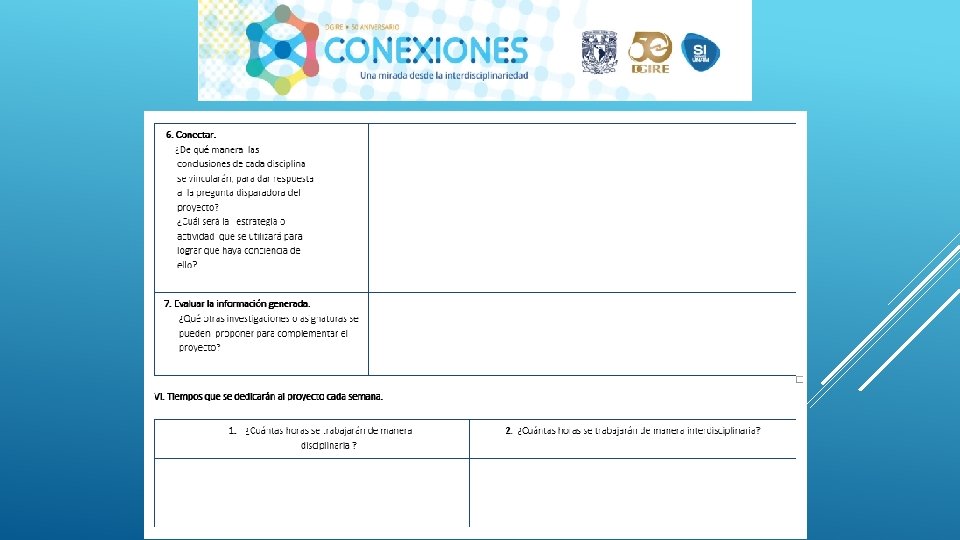 En general el Proyecto “CONEXIONES” como su nombre lo dice ayuda a conectar distintas disciplinas en este caso educativas, sin duda alguna se necesita tener este tipo de proyectos interdisciplinarios para que en el proceso de Enseñanza-Aprendizaje podamos contribuir a la formación de nuestros alumnos de una manera integral, considerando en primer lugar los programas y planes. Nos queda claro que el Profesor deberá conocer y dominar los contenidos de su programa, a su vez también tendrá la necesidad de conocer de manera general las demás materias y con ello realizar proyectos que puedan integrar la visión de las distintas áreas que integran un proyecto interdisciplinario, y con ello generar el trabajo cooperativo tanto de profesores como de alumnos. Es importante también tomar en cuenta que la interdisciplinariedad tiene como misión generar en los alumnos una actitud socioconductivista, en donde el alumnos pueda llegar a generar su propio conocimiento y que considere la aplicación que tiene cada uno de los proyectos en su vida diaria. La interdisciplinariedad es una vía para la mejora continua en el Proceso Enseñanza-Aprendizaje, ya que te permite innovar y hacer más atractivo cada uno de los conocimientos vistos en clase.