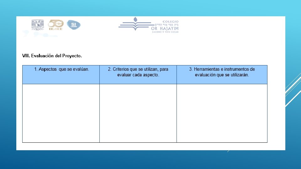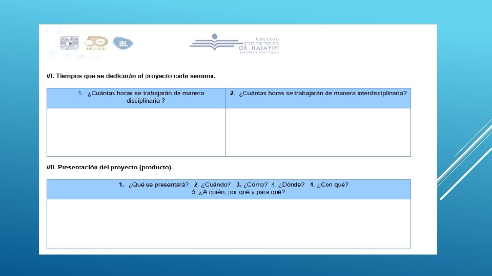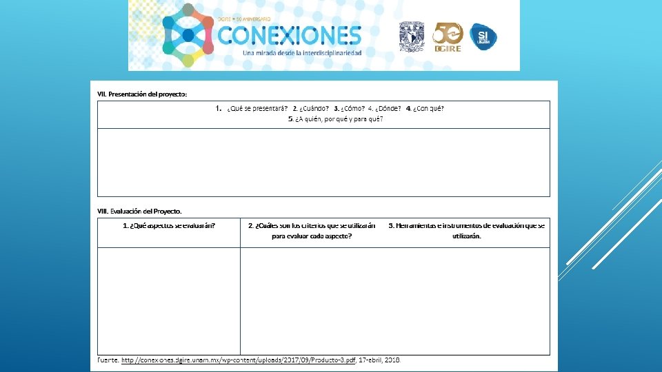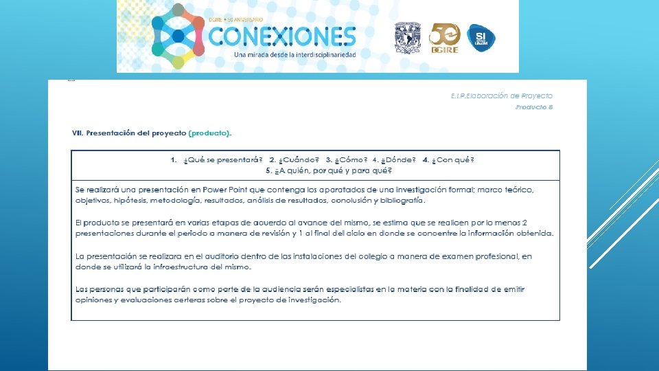 ÍNDICE 5 a Producto 1. C. A. I. A. C. Conclusiones Generales. Interdisciplinariedad. Producto 3. Fotografías de la sesión. 5 b Producto 2. Fotografía de Organizador Gráfico. 5 c Introducción o justificación. Descripción del proyecto. 5 d Objetivo general del proyecto. Objetivo o propósitos a alcanzar, de cada asignatura involucrada. 5 e Pregunta/s generadora/s, pregunta/s guía, problema/s a abordar, asunto a resolver o a probar, propuesta del proyecto a realizar, etc. 5 f Contenido. Temas y productos propuestos. 5 g Planeación general. Planeación día a día. Seguimiento. Evaluación. Autoevaluación y coevaluación.