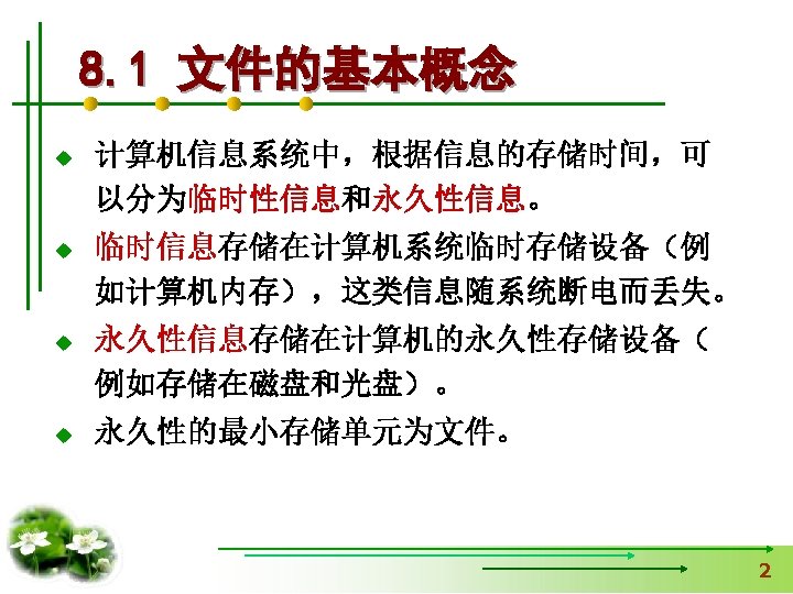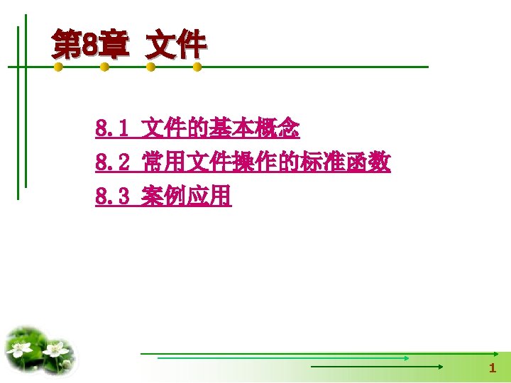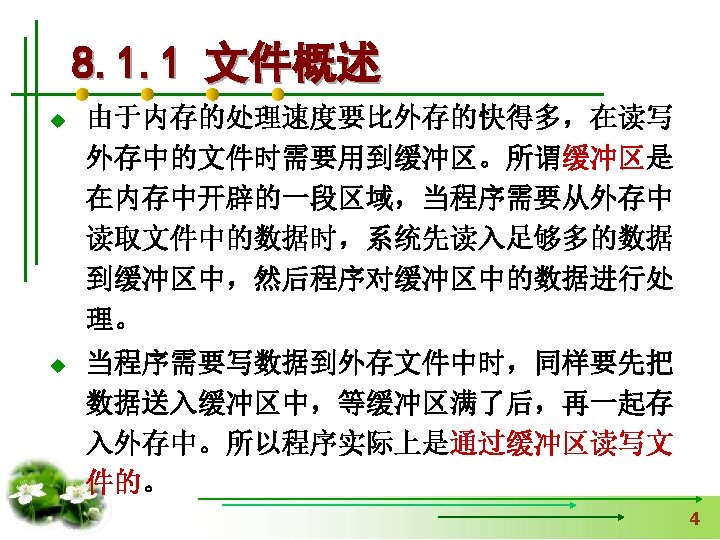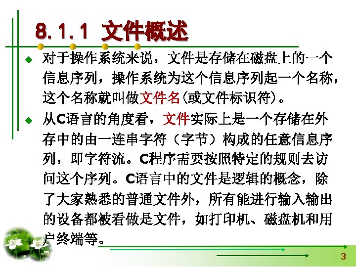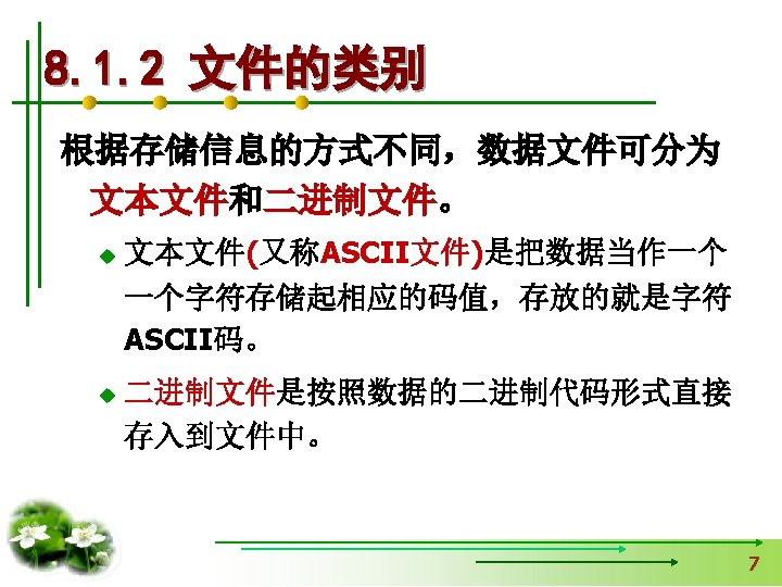 8. 1. 2 文件的类别 文本文件(ASCII文件) 00110001 00110000 (1) (0) (0) 二进制文件 00000000 00100111 00010000 (10000) 8