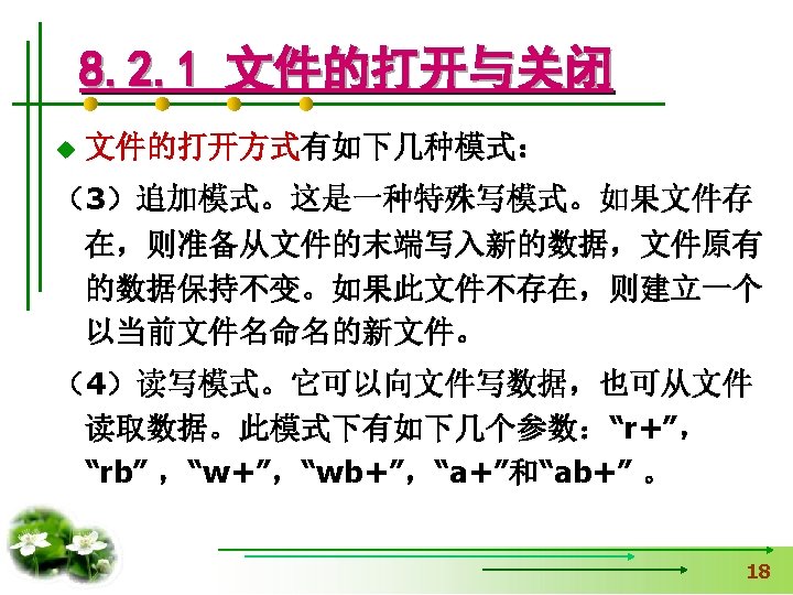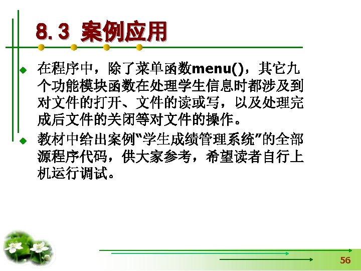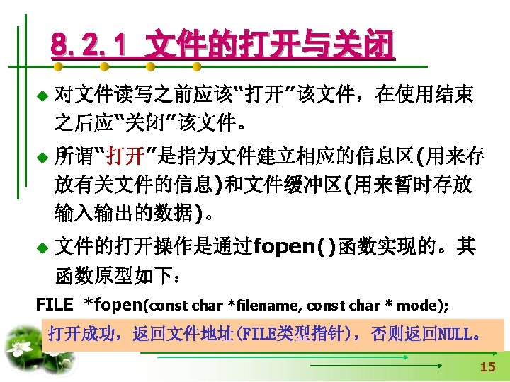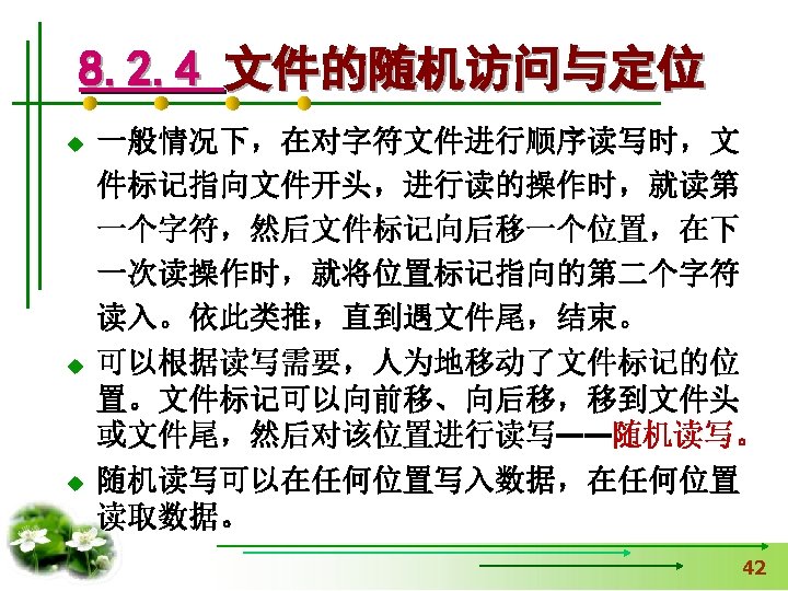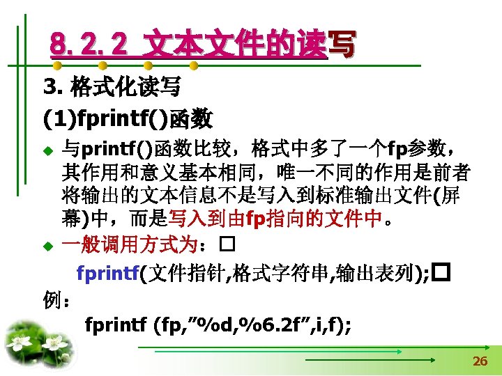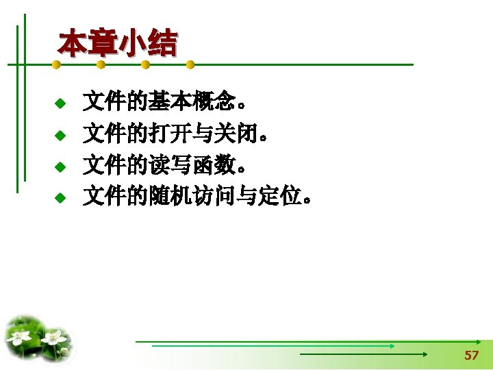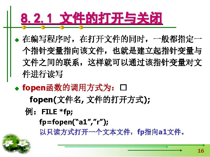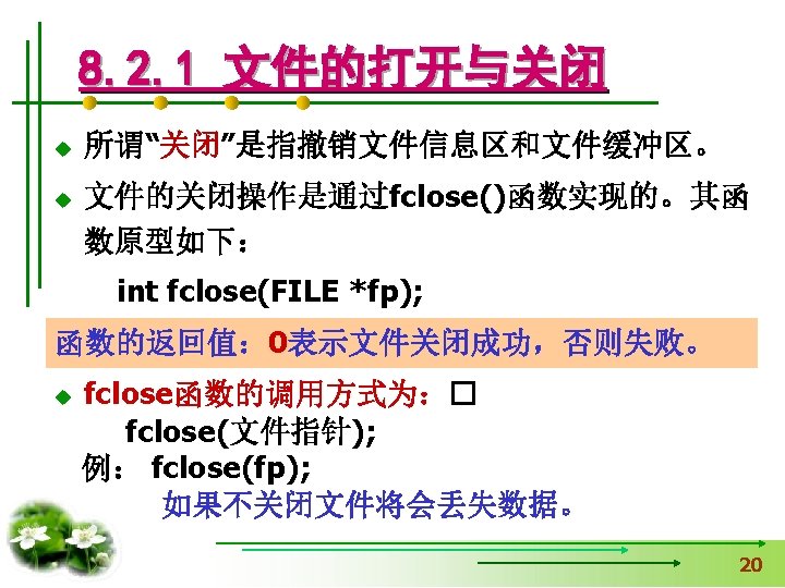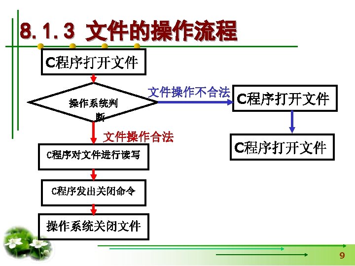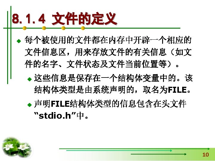 #include <stdio. h> 【例8. 1】打开名为“a. txt”的 文件,并向文件输出字符 #include <stdlib. h> 串“Test. File”,然后关闭 void main() 用exit函数时加 文件,同时在屏幕上输出 { fclose的返回值。 FILE *fp. File; int n. Status=0; If(fp. File=fopen("a. txt", "w+"))==NULL) { 读写方式 printf(“Open file failed!n”); exit(0); 中断正在执行的程序 } fprintf(fp. File, "%s", "Test. File"); n. Status=fclose(fp. File); printf("%d", n. Status); }