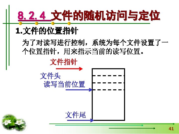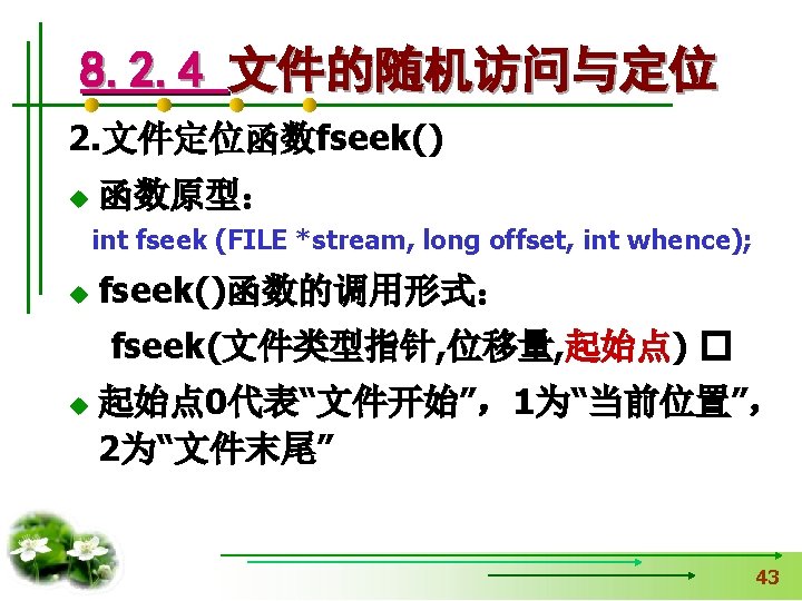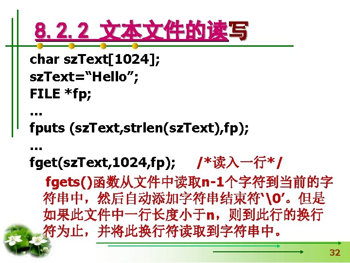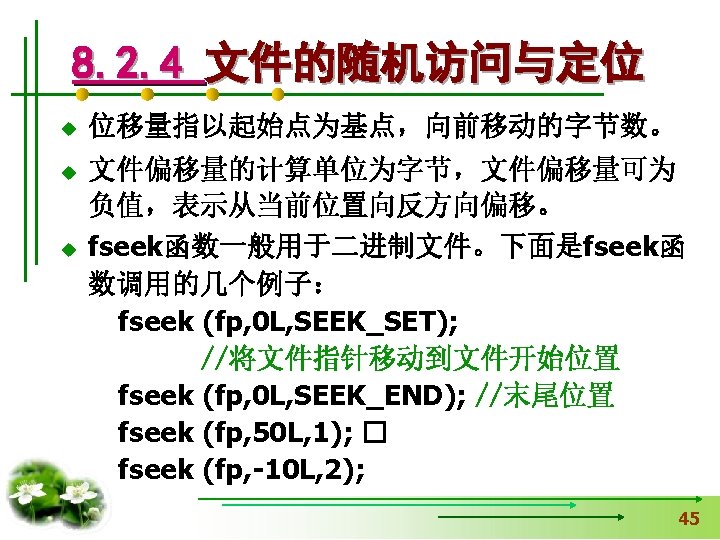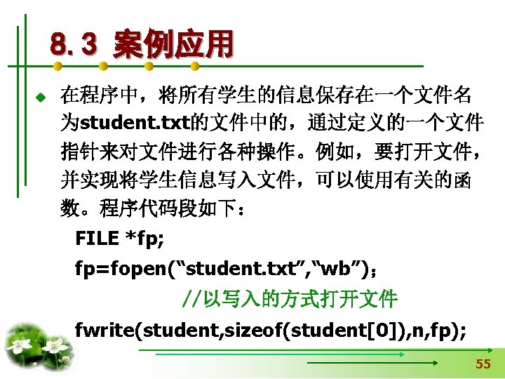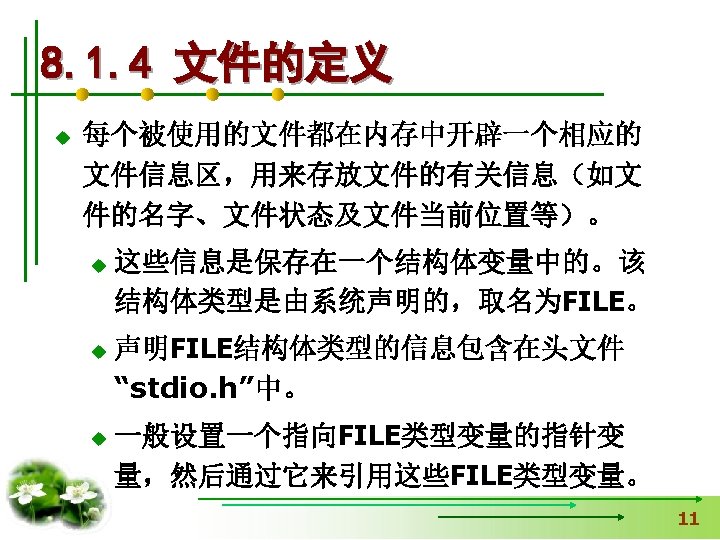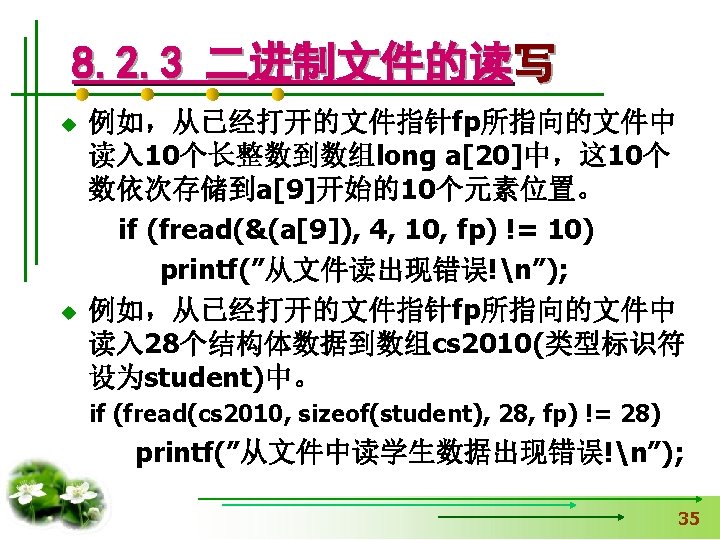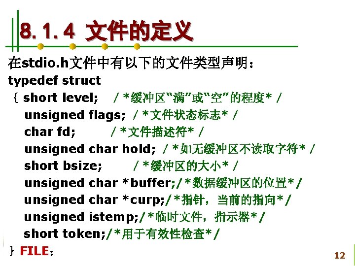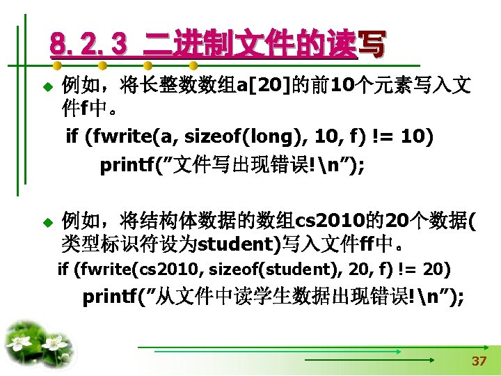 使文件指针相对文件头偏移i个学生数 据量,即指向第i+1个学生数据。 fseek(fp, i*sizeof(struct student), SEEK_SET); if (fread(&stud, sizeof(structstudent), 1, fp)==1) { printf(“%s, %d, %sn”, stud. name, 从文件中读出一块结构体类 stud. age, stud. num); } 型数据放在stud变量中 else printf(“record 3 does not presented. n”); fclose(fp); }
