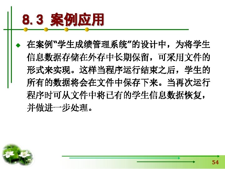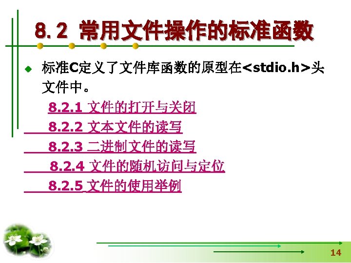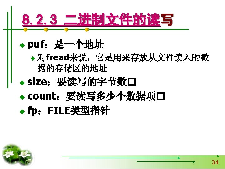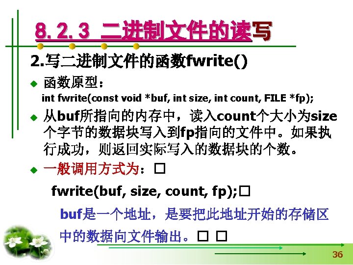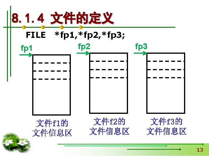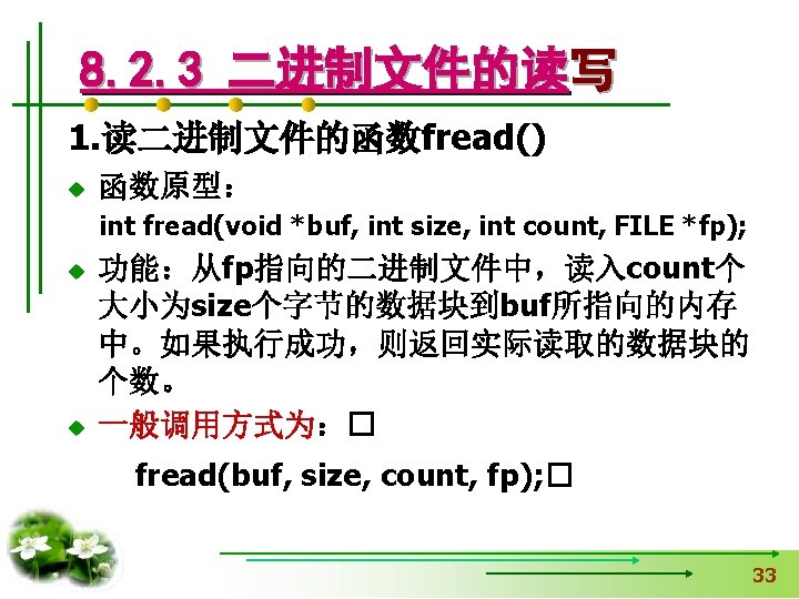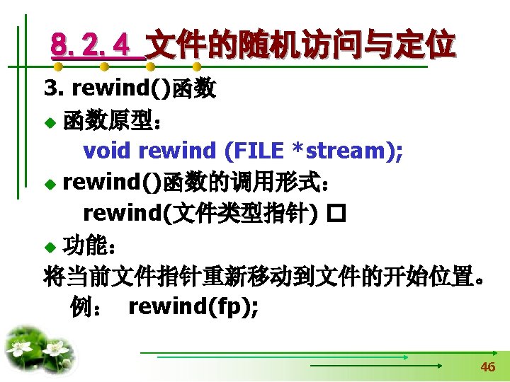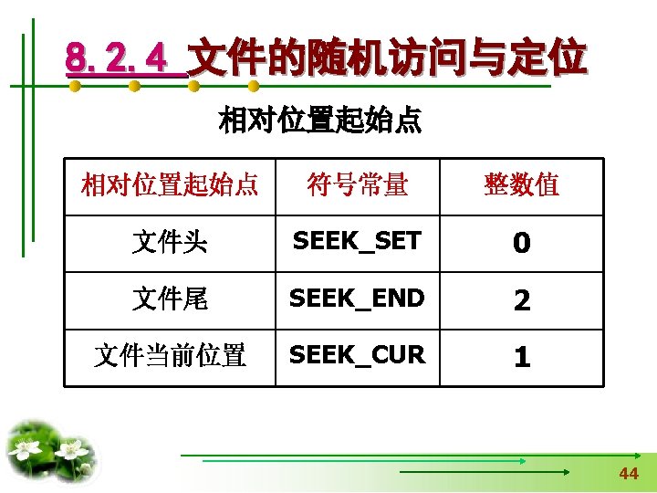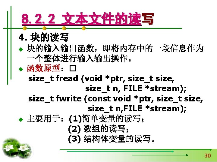 使文件指针相对文件头偏移i个学生数 据量,即指向第i+1个学生数据。 fseek(fp, i*sizeof(struct student), SEEK_SET); if (fread(&stud, sizeof(structstudent), 1, fp)==1) { printf(“%s, %d, %sn”, stud. name, 从文件中读出一块结构体类 stud. age, stud. num); } 型数据放在stud变量中 else printf(“record 3 does not presented. n”); fclose(fp); }