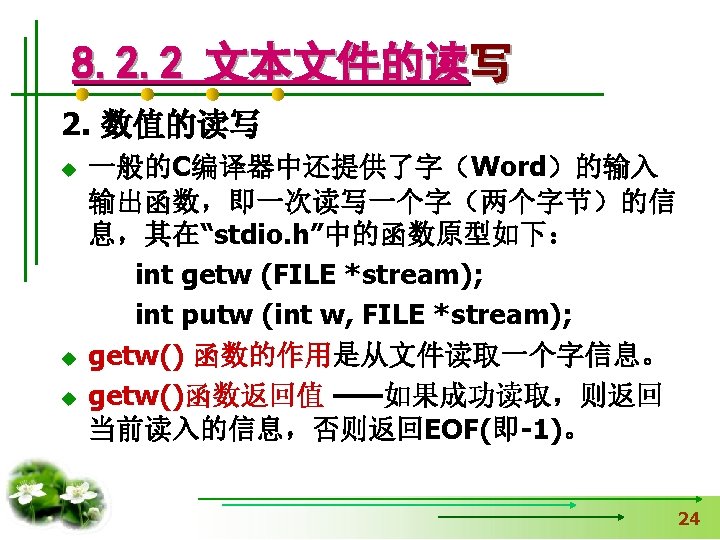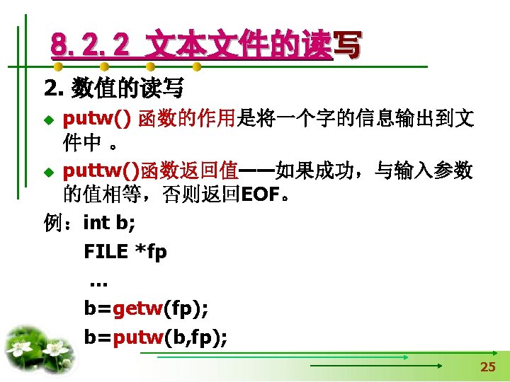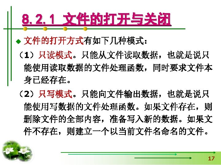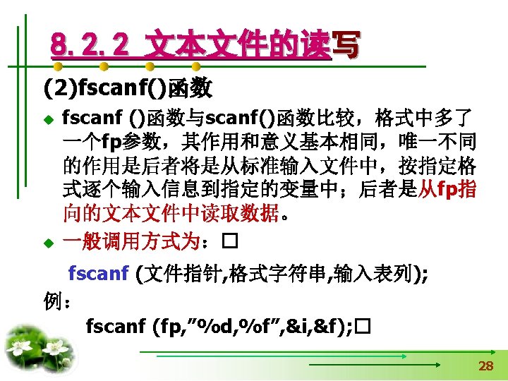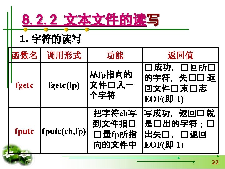 #include <stdio. h> 【例8. 2】从键盘读取字符,并 #include <stdlib. h> 输出到“text. txt”文件中。 void main() 用exit函数时加 { FILE *fp. File; 只写 char c; if(fp. File=fopen("c: \test. txt", "w"))==NULL) { printf("Open file failed!n"); exit(0); } while((c=getchar())!='Q') 不断输入字符,直到 输入字母’Q’为止。 fputc(c, fp. File); fclose(fp. File); }