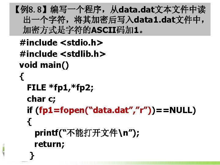 if (fp 2=fopen(“data 1. dat”, ”w”))==NULL) { printf(“不能建立文件n”); return; } while (!feof(fp 1)) { c=fgetc(fp 1); c=(c+1)%256; fputc(c, fp 2); } fclose(fp 1); fclose(fp 2); }