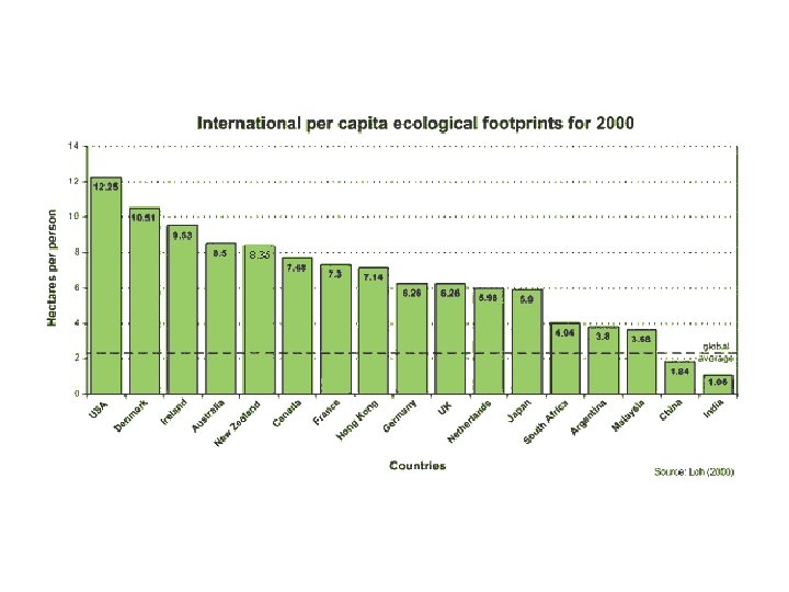 Approximate Ecological Footprints (2003) • • • USA – 10. 3 ha cap-1 Australia – 9. 0 Canada – 7. 8 Germany – 5. 3 UK – 5. 2 Switzerland – 5. 1 Mexico 3. 0 (2007 data) China – 1. 6 India – 0. 8 In 2003, there were approx. only 1. 8 ha available person (including productive marine areas). Therefore many of us are living beyond the Earth’s ability to sustain the population Which country do you think currently has the largest ecological footprint?