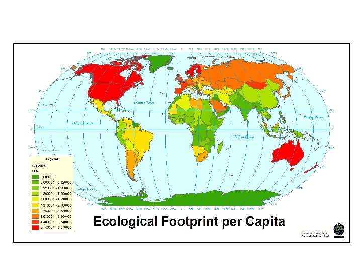 Ecological Footprint • A country with a total ecological footprint greater than its available land is in theory living beyond its means (It has an ecological deficit)