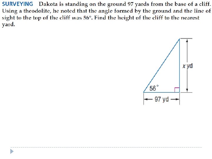 Homework pg. 308 7 -18, 21 -24, 27 � If looking for a leg, you will just use the tan button. � Remember tan-1 to find an angle measurement you use