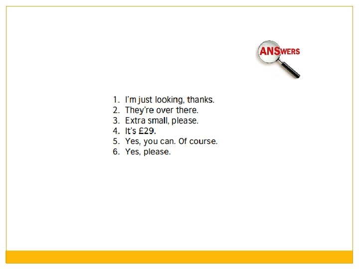 Dá uma olhada nas expressões comuns de um diálogo de compras Salesperson: Can I help you? Gloria: Yes, I’m looking for a sweater — in a size medium. Salesperson: Let’s see…here’s a nice white one. What do you think? Gloria: I think I’d rather have it in blue. Salesperson: OK…here’s blue, in a medium. Would you like to try it on? Gloria: OK…yes, I love it. It fits perfectly. How much is it? Salesperson: It’s $50. It will be $53 with tax. Gloria: Perfect! I’ll take it.