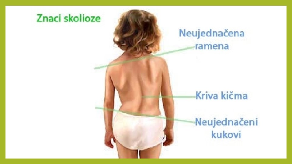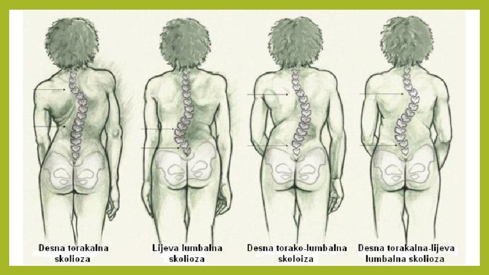 SKOLIOZE – DEFINICIJA I PODJELA - skolioza predstavlja svako iskrivljenje kralježnice gledano sprijeda ili straga u frontalnoj ravnini - može biti izražena u desnu ili lijevu stranu, a može biti i obostrana te tada nailazimo na dvije krivine - prema broju krivina, mogu biti jednostruke i višestruke - prema dijelu kralježnice koji je zahvaćen mogu biti lumbalne, torakalne i torakolumbalne