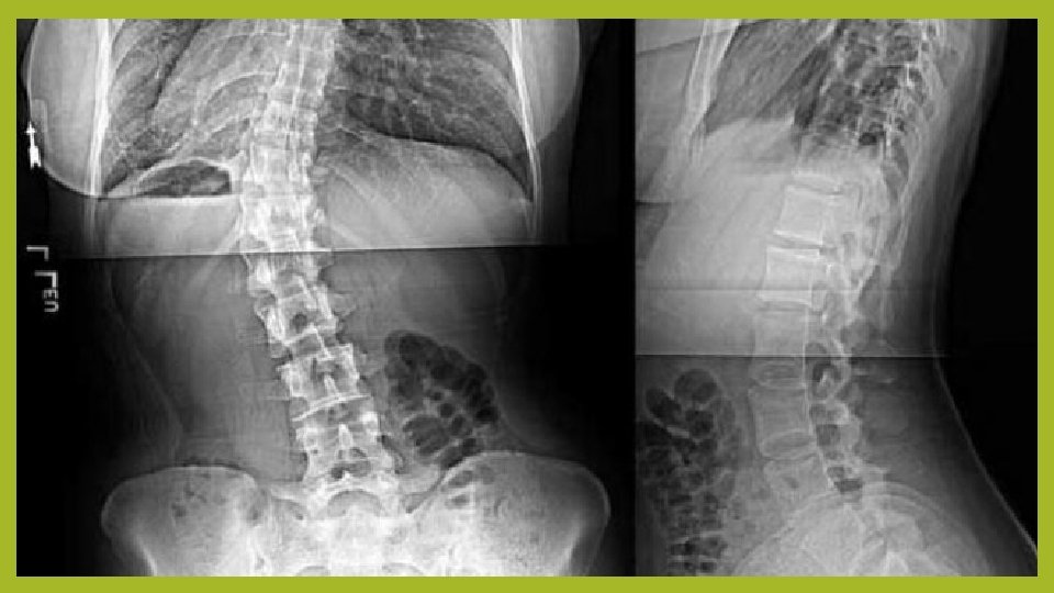 PREGLED I DIJAGNOSTIKA - obiteljska i osobna anamneza - specifične metode fizikalne pretrage (gibometrija, mjerenje duljine donjih ekstremiteta) - rendgensko snimanje kralježnice - bolesnika promotriti u stojećem stavu, promatra se horizontalni položaj ramena i zdjelice, balans trupa i položaj lopatica - test pretklona; ako postoji asimetrija ramena i lopatica, a gibusa nema, radi se samo o skoliotičnom držanju, odnosno nestrukturalnoj skoliozi