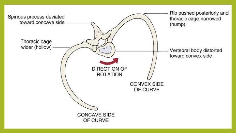 STRUKTURALNE SKOLIOZE - kod torakalne strukturalne skolioze rebra prate rotaciju kralježnice i tako nastaju grbe (gibusi): stražnja rebrena grba na strani konveksiteta skoliotičnog zavoja i prednja rebrena grba na strani konkaviteta skoliotičnog zavoja - kod lumbalne strukturalne skolioze postoje i grbe, ali kako nema rebara, one su mnogo manje nego što bi bile u torakalnom segmentu