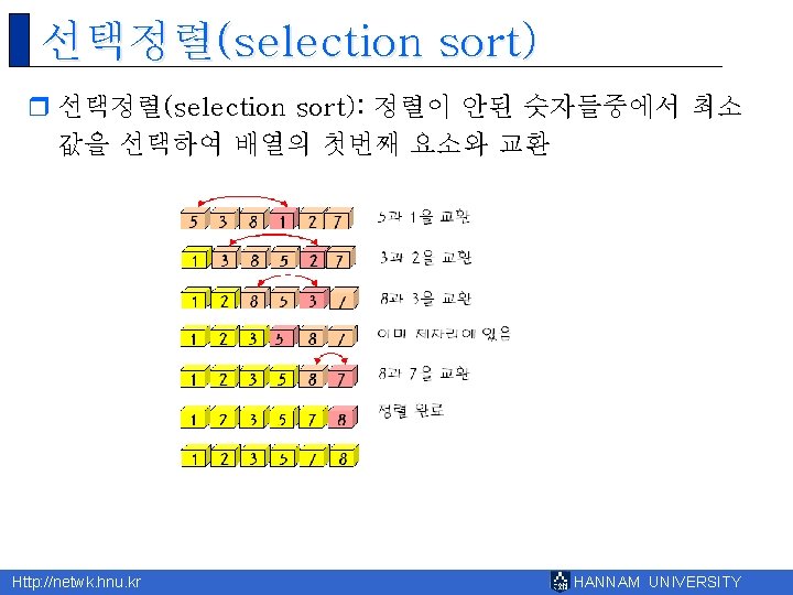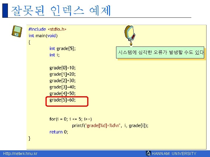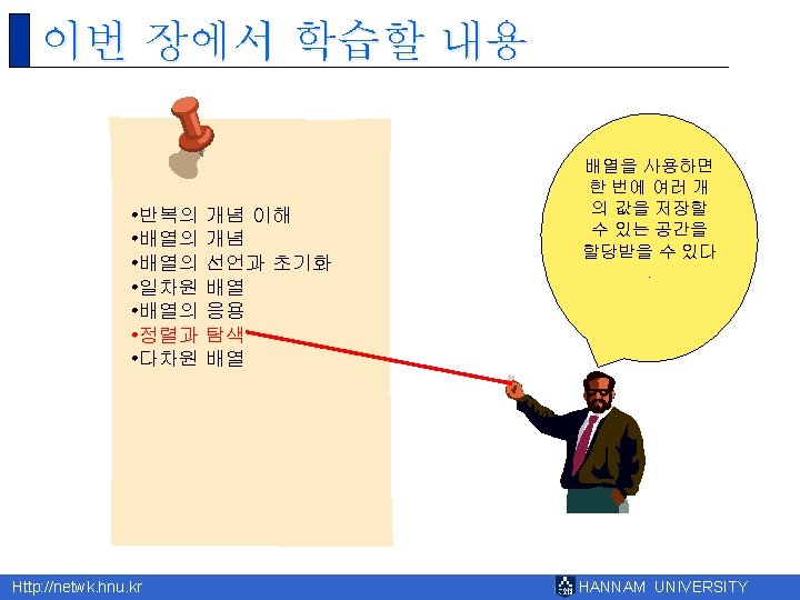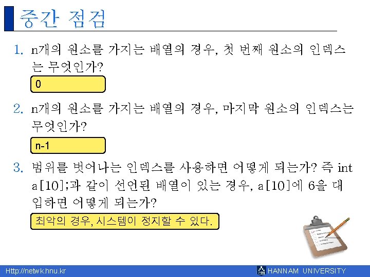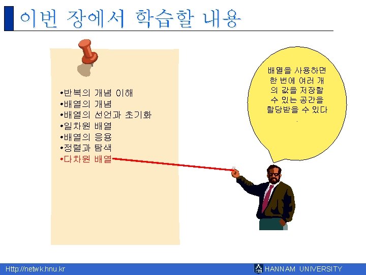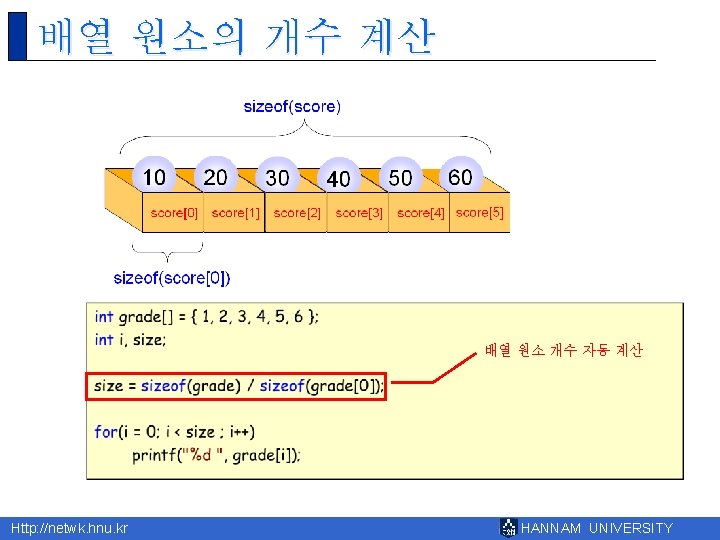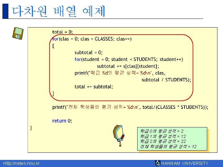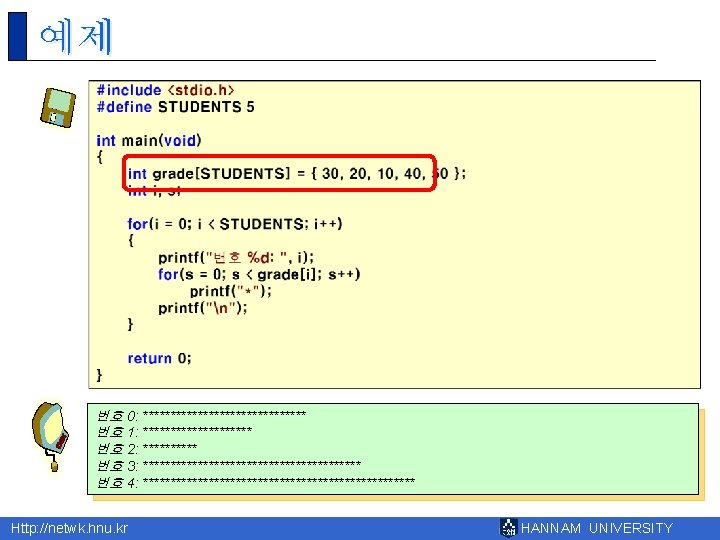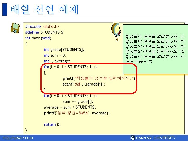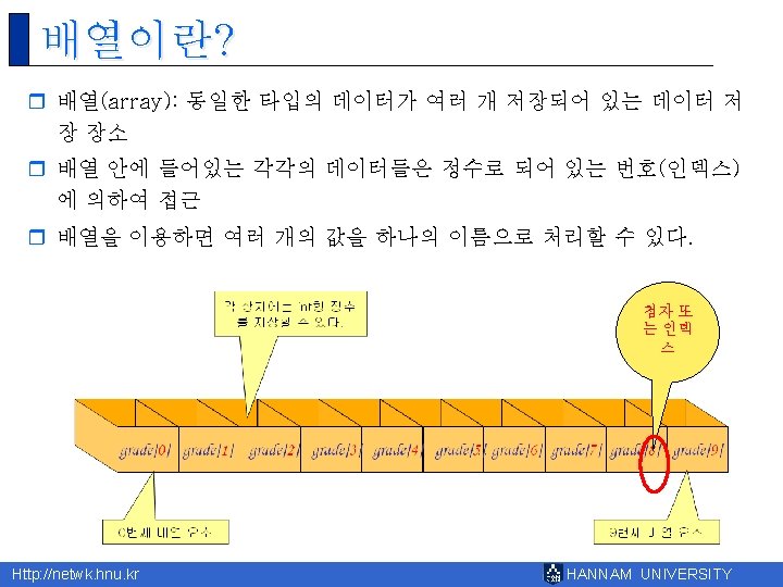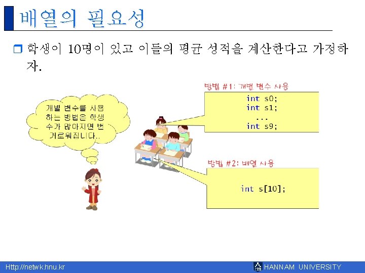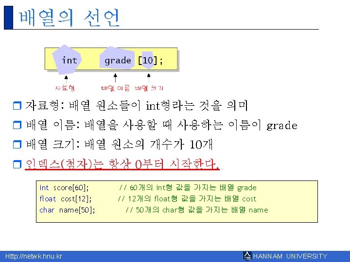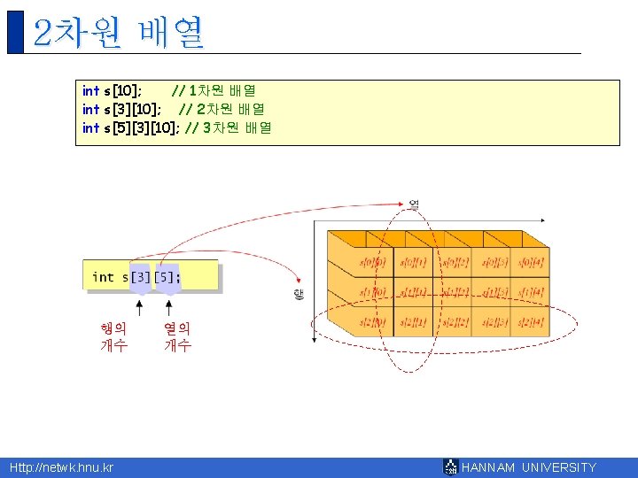 8 Http netwk hnu kr HANNAM UNIVERSITY 1 Slides: 43 Download presentation 제 8장 배열 Http: //netwk. hnu. kr HANNAM UNIVERSITY 1 배열의 필요성 Http: //netwk. hnu. kr HANNAM UNIVERSITY 배열 선언 예제 grade[0]=10 grade[1]=20 grade[2]=30 grade[3]=40 grade[4]=50 Http: //netwk. hnu. kr HANNAM UNIVERSITY 배열 선언 예제 grade[0]=41 grade[1]=67 grade[2]=34 grade[3]=0 grade[4]=69 Http: //netwk. hnu. kr HANNAM UNIVERSITY 배열 선언 예제 grade[0]=41 grade[1]=67 grade[2]=34 grade[3]=0 grade[4]=69 Http: //netwk. hnu. kr HANNAM UNIVERSITY 배열의 초기화 r int grade[5] = { 10, 20, 30, 40, 50 }; r int grade[5] = { 10, 20, 30 }; Http: //netwk. hnu. kr HANNAM UNIVERSITY 배열 초기화 예제 grade[0] = 31 grade[1] = 63 grade[2] = 62 grade[3] = 87 grade[4] = 14 Http: //netwk. hnu. kr HANNAM UNIVERSITY 배열 초기화 예제 grade[0] = 31 grade[1] = 63 grade[2] = 0 grade[3] = 0 grade[4] = 0 Http: //netwk. hnu. kr HANNAM UNIVERSITY 배열 초기화 예제 grade[0]=4206620 grade[1]=0 grade[2]=4206636 grade[3]=2018779649 grade[4]=1 Http: //netwk. hnu. kr HANNAM UNIVERSITY 선택 정렬 1/2 Http: //netwk. hnu. kr HANNAM UNIVERSITY 선택 정렬 2/2 0123456789 계속하려면 아무 키나 누르십시오. . . Http: //netwk. hnu. kr HANNAM UNIVERSITY 2차원 배열의 활용 Http: //netwk. hnu. kr HANNAM UNIVERSITY 2차원 배열의 초기화 Http: //netwk. hnu. kr HANNAM UNIVERSITY 2차원 배열의 초기화 Http: //netwk. hnu. kr HANNAM UNIVERSITY 2차원 배열의 초기화 Http: //netwk. hnu. kr HANNAM UNIVERSITY 다차원 배열 예제 Http: //netwk. hnu. kr HANNAM UNIVERSITY 다차원 배열을 이용한 행렬의 표현 Http: //netwk. hnu. kr HANNAM UNIVERSITY 다차원 배열을 이용한 행렬의 표현 3 3 0 9 9 1 8 0 5 Http: //netwk. hnu. kr HANNAM UNIVERSITY Q&A Http: //netwk. hnu. kr HANNAM UNIVERSITY