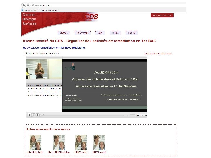 Les « séances CDS » : fréquentation 1426 participants / 56 séances (25, 5 participants / séance) Top 6 : (> 50 participants) • Séance 22 - Promouvoir la recherche bibliographique en 1ère année de BAC : 64 • Séance 21 - Favoriser l'acquisition d'un système de travail adapté à l'enseignement universitaire : 58 • Séance 18 - Concevoir et utiliser des supports multimédias (Power. Point, Tableau Interactif, Vidéos) pour l'enseignement en Amphi : 58 • Séance 36 - Mettre en place une évaluation formative : 52 • Séance 34 - Comprendre les facteurs de réussite et d'échec en 1 er BAC : 50 • Séance 29 - L’E-Learning au service de nos activités de 1 er bac : 21 50