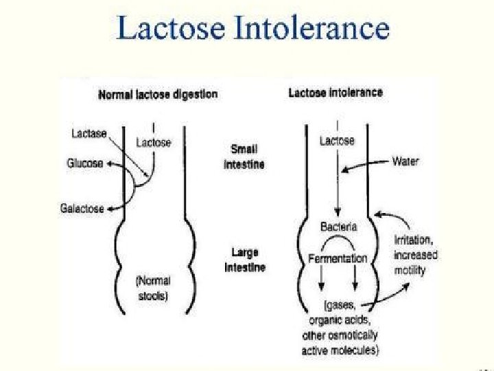 Lactose Intolerance causes Inherited lactase deficiency Congenital lactase deficiency Childhood-onset and adult-onset lactase deficiency extremely rare common Genetically programmed progressive loss of the activity of the small intestinal enzyme lactase. Gastroenteritis: Infectious diarrhea, particularly viral gastroenteritis in younger children, may damage the intestinal mucosa enough to reduce the quantity of the lactase enzyme. Acquired lactase deficiency Transient Secondary lactase deficiency due to intestinal mucosal injury by an infectious, allergic, or inflammatory process