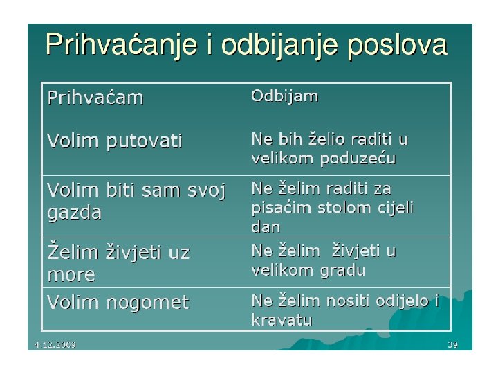 Procjene vlastitih mogućnosti Procjena vlastitih mogućnosti se odnosi i implicira na popisnu ljestvicu pozitivnih točaka i slabosti, te na popis tipova poslova koji se prihvaćaju, ili odbijaju.