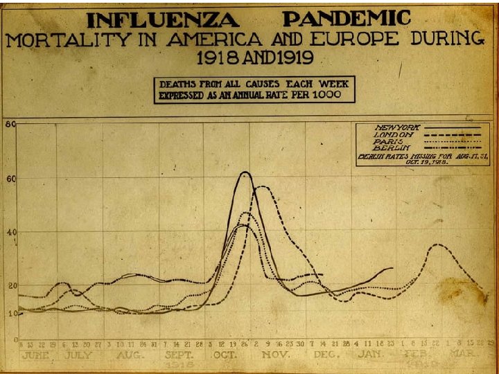 Pandemic, The Movie • Sudden onset of severe cough, shortness of breath, headache, bleeding from nose and lungs, turning blue and followed by death in 4 -6 hours • No treatment works • Spreads rapidly, without physical contact • ~50% transmission rate • Affects people 18 -30 preferentially and kills ~8% of this age group in the world • 100 million people in two episodes of two months each • In 24 weeks more people dead of acute illness than died in 100 years of Bubonic Plague This was the actual scenario in 1918