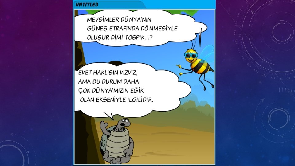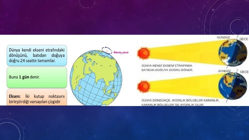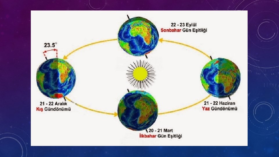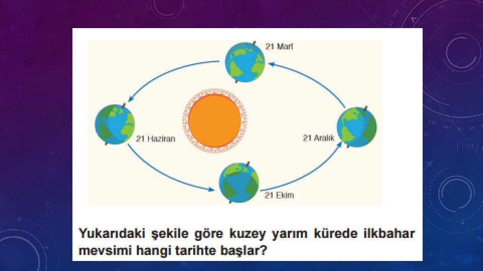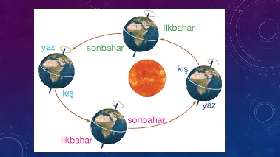 AÇIKLAMA • Dünya sadece kendi etrafında dönmez ayrıca Güneş’in çevresinde de dolanır. Bu dolanma sırasında dört mevsim oluşur. • Bu, dönüşünde Dünya’nın yarısı yaz mevsimini yaşarken diğer yarısı kış mevsimini yaşar. Bu, dönüşümlü olarak devam eder. • Dünya, Güneş etrafındaki dolanımını tamamladığında 1 yıl, 4 mevsim, 12 ay, 52 hafta, 365 gün 6 saat meydana gelir.