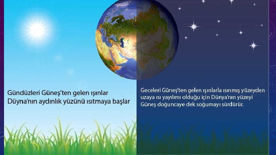 • Güneş ışınlarının yeryüzünü ısıttığını biliyoruz. • Güneş ışınları hava olaylarında etkili olduğu kadar yeryüzünün ısınmasında da etkilidir. • Dünya’nın Güneş ışınlarını alan kesimlerinin gündüz, Güneş ışığı almayan kısmının ise gece olduğunu biliyorsunuz. • Bunun sonucunda Güneş ışınlarının dik geldiği bölgelerde hava sıcaklığı artar. Güneş ışınlarının yatay geldiği veya hiç gelmediği bölgelerde ise hava biraz serin olur. • Gece ile gündüz arasındaki sıcaklık farkı bundan kaynaklanır.