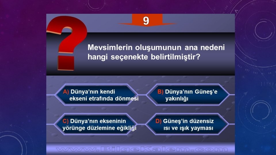 • Ayrıca Dünya ekseninin 23, 5 derece olması ve elips şeklinde bir yol izlemesi sebebiyle Güneş ışıkları yeryüzüne her zaman aynı eğim ve aynı uzaklıkla gelmez. • Dünya’nın Güneş’ten aldığı ısı ve ışık enerjisi değişir. • Bunun sonucunda da mevsimler oluşur.