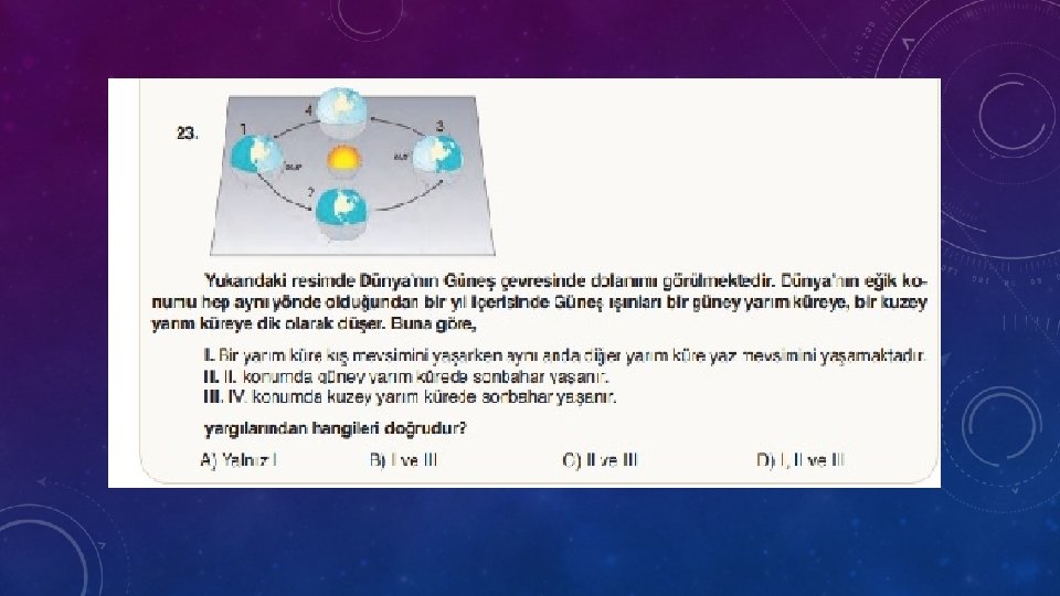 5. Dünya’mızda mevsimlerin oluşmasının sebebi aşağıdakilerden hangisinde doğru olarak verilmiştir? A) Dünya’nın sahip olduğu kütle çekimidir B) Ay’ın Dünya etrafında dolanmasıdır C) Dünya’nın dönme ekseninin eğikliğidir D) Dünya’nın Güneş ile arasındaki uzaklıktır 6. Güney yarım kürede ilkbahar başlangıcı olan tarih hangisidir? A) 21 MART B) 4 TEMMUZ C) 21 HAZİRAN D) 23 EYLÜL