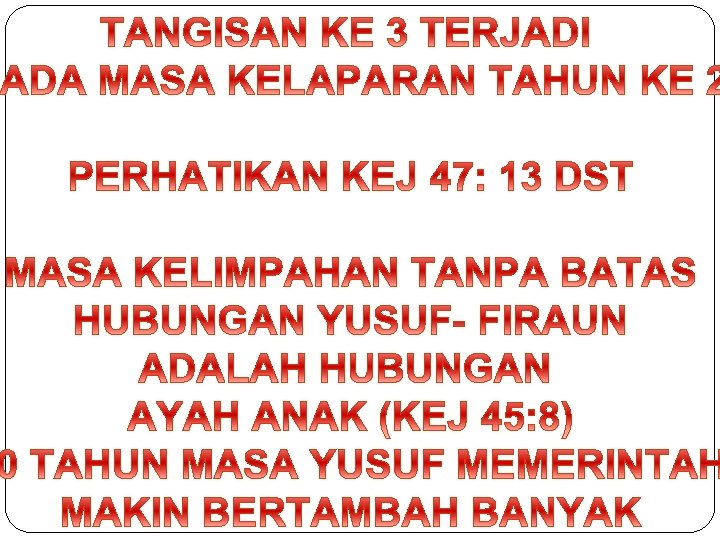 3 KEMUNGKINAN MENGAPA YUSUF TIDAK MENANGIS, DALAM 7 TIKUNGAN TERJAL ITU. . ? 1. VISI YANG KUAT 2. KEDEKATAN DENGAN TUHAN 3. TAHAN MENDERITA