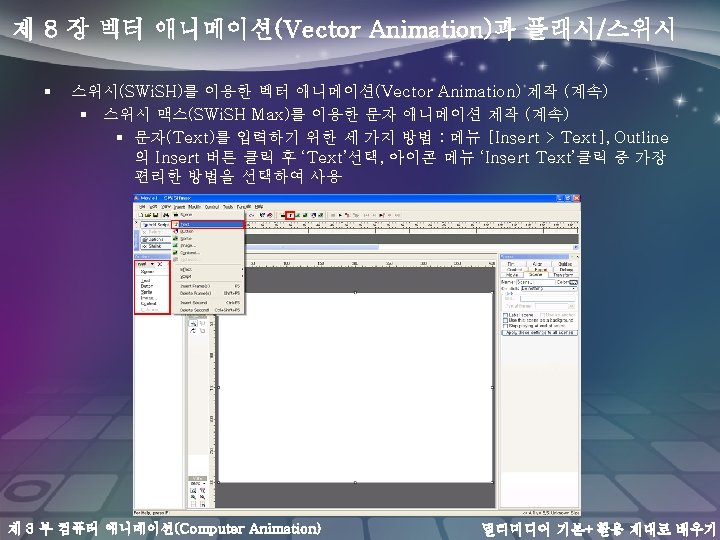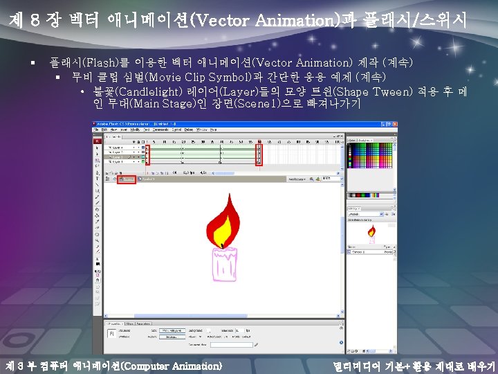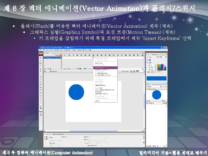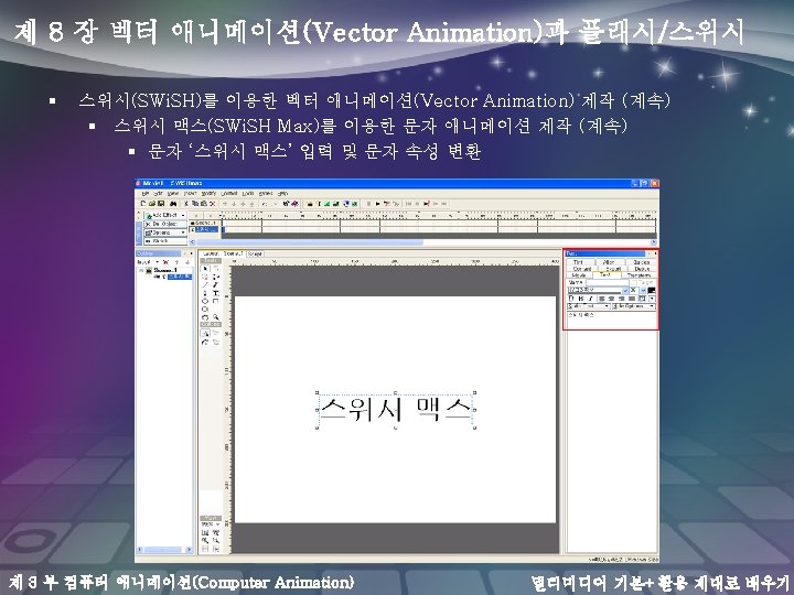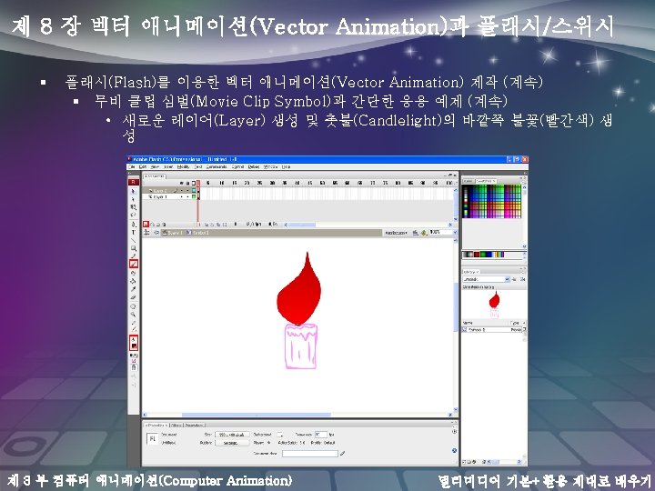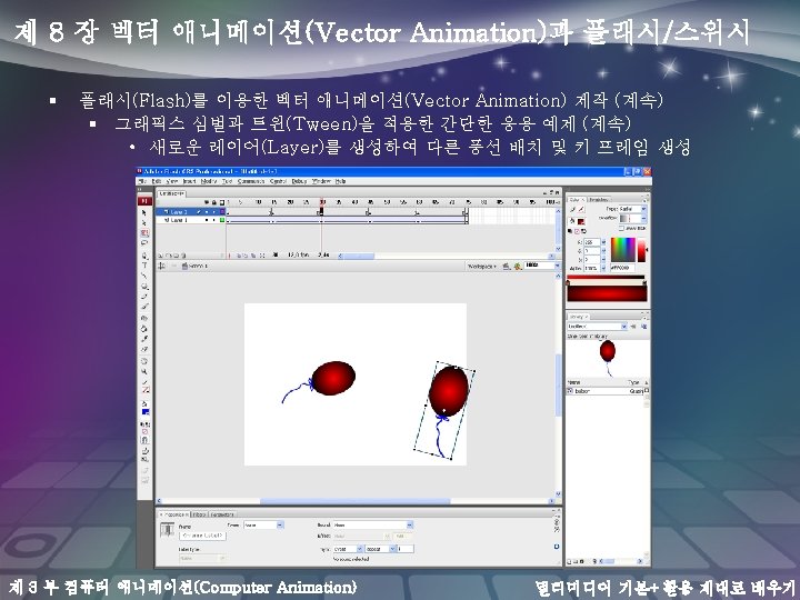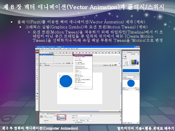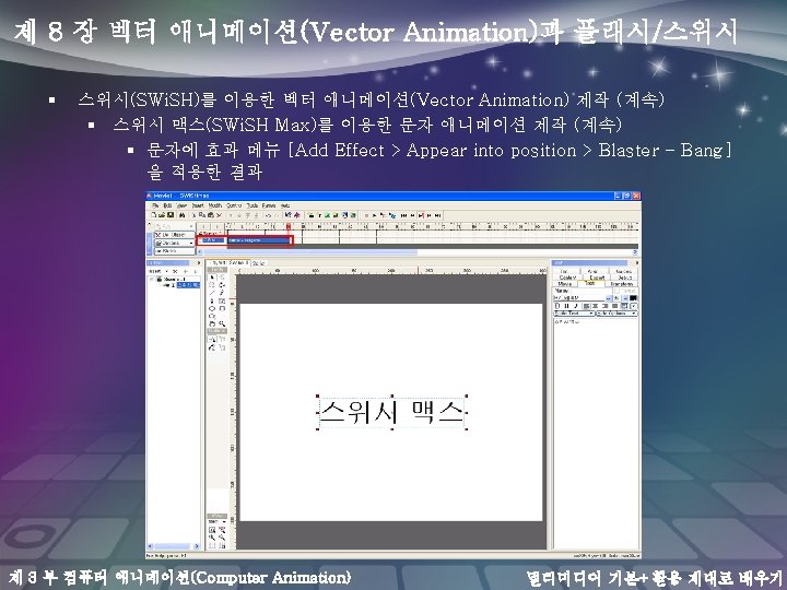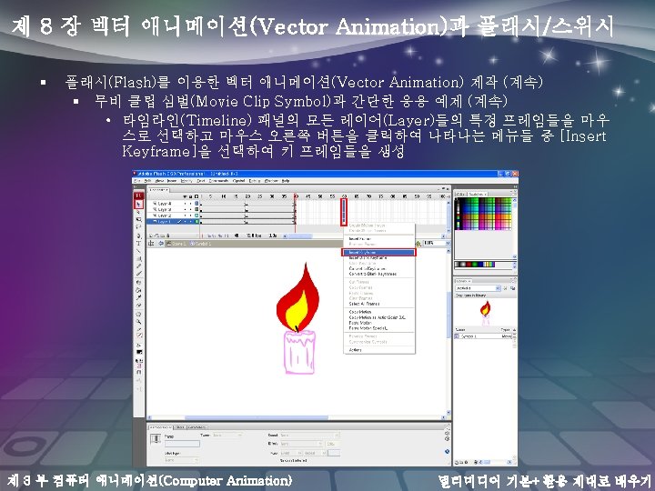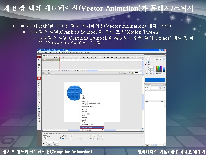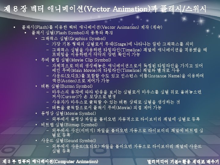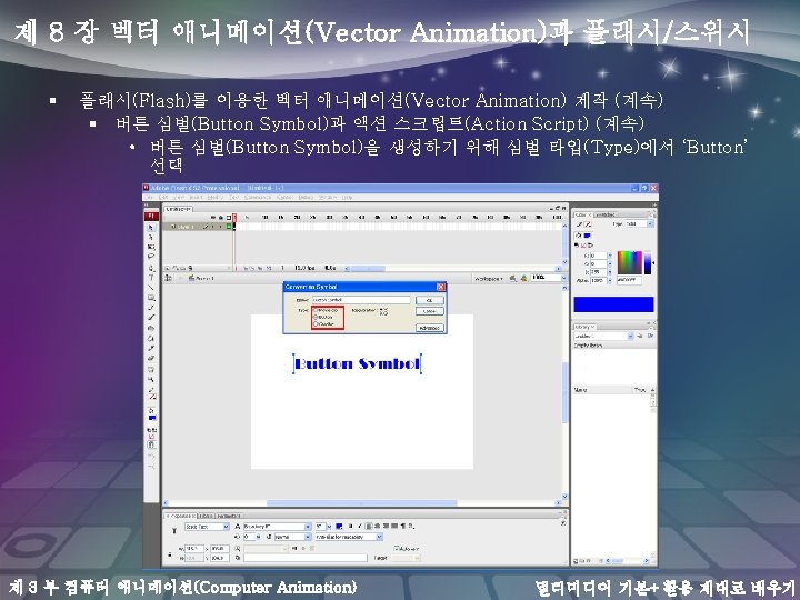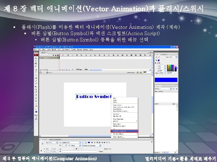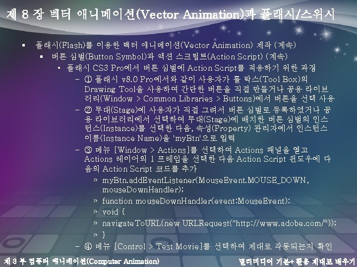 제 8 장 벡터 애니메이션(Vector Animation)과 플래시/스위시 § 플래시(Flash)를 이용한 벡터 애니메이션(Vector Animation) 제작 (계속) § 버튼 심벌(Button Symbol)과 액션 스크립트(Action Script) (계속) • AS v 3. 0의 환경에 맞게 버튼 심벌을 URL에 링크시키는 과정 (계속) – Action 패널을 열고 Action Script 코드를 입력 my. Btn. add. Event. Listener(Mouse. Event. MOUSE_DOWN, mouse. Down. Handler); function mouse. Down. Handler(event: Mouse. Event): void { navigate. To. URL(new URLRequest("http: //www. adobe. com/")); } 제 3 부 컴퓨터 애니메이션(Computer Animation) 멀티미디어 기본+활용 제대로 배우기