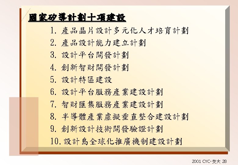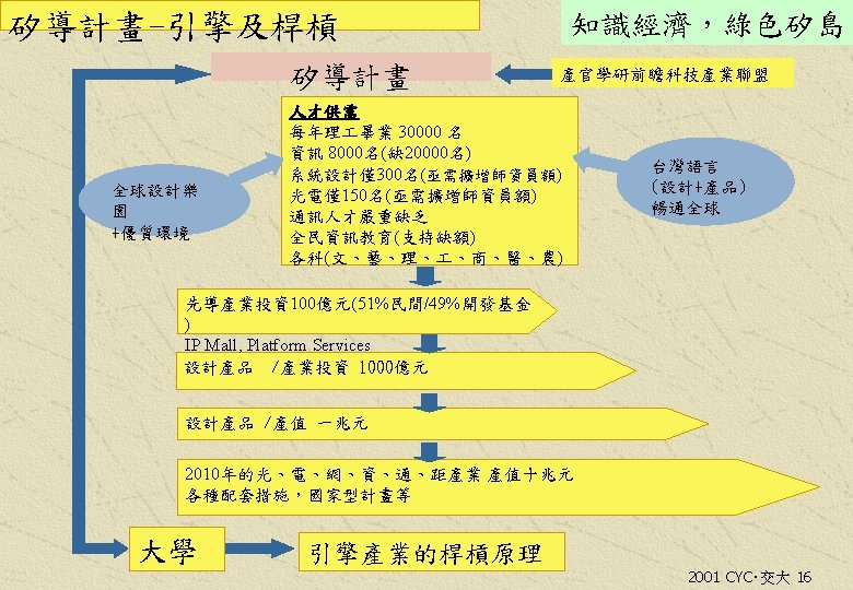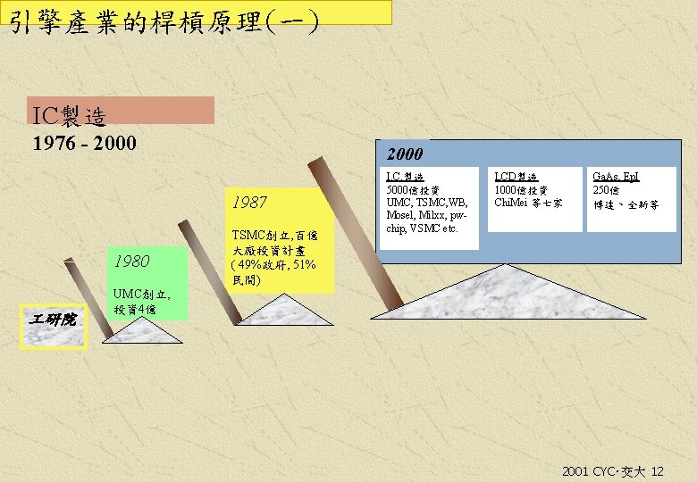 產官學研前瞻科技產業策略 知識經濟,綠色矽島 National Si -Soft Project – The engine of all industries The food Chain of Si. Soft Family. I. A. PDA , Game Human/Art Intennet Intra-net E. O. LCD, Opt. Comm. , Storage Sw, Router , protocal, e/s, BB, App 1. 矽導計畫 Energy Batt. , Cell. COMM Wireless, Satellite Mems 無所不在 Omni – Presence Nano 無孔不入Pervasiveness 短小輕薄省又慧 P-SOC Si-Soft SOC, e/b s/w, EDA, IP, Product verify foundary S/W O/S System Integration Bio-Medi Bio-info Bio-chip B-M-E Si-Hard Foundary, Ga. As ODM / OEM, Service Material Mech Auto, aero, Package Civil Environ. Chem. 2001 CYC‧交大 11