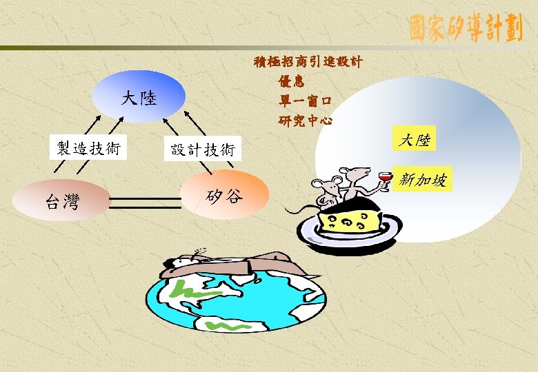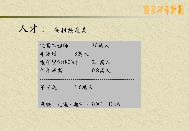 80% Design Houses, Product Houses 設計環境 (平台服務) 製造環境: Foundry, Testing, package, PCB, Modeling System Designer Circuit Designer EDA CAD Engineer Software Engineers Manufactures IP Designers Knowledge Intensive, Technology Intensive, Innovation Intensive Need Human Resources, Need Technology, Need Environment