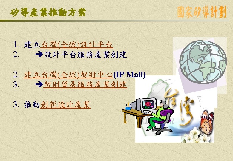 2. 台灣(全球)智財中心(IP Mall)建立 智財貿易服務產業創建 Taiwan IP Mall Innovation Knowledge Invention …. . Worldwide IP Promotion Promote Taiwan IP  網路  AP 通訊  OS  光電  Product Taiwan Languages 資訊  IC 生醫  IP Easy for Taiwan Design Promote Taiwan SOC Design Promote Taiwan Product 22