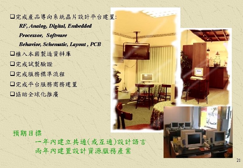 1. 台灣(全球)設計平台之建立 設計平台服務產業之創建 Taiwan Language RF-Analog-Digital-Software Cadence Synopsys Mentor Avant! Agilent Foundry  IC/IP  Mask Testin g  EDA Package Worldwide EDA Promotion Promote Taiwan Solution Easy for Taiwan Design Promote Taiwan EDA Promote Taiwan Services 20