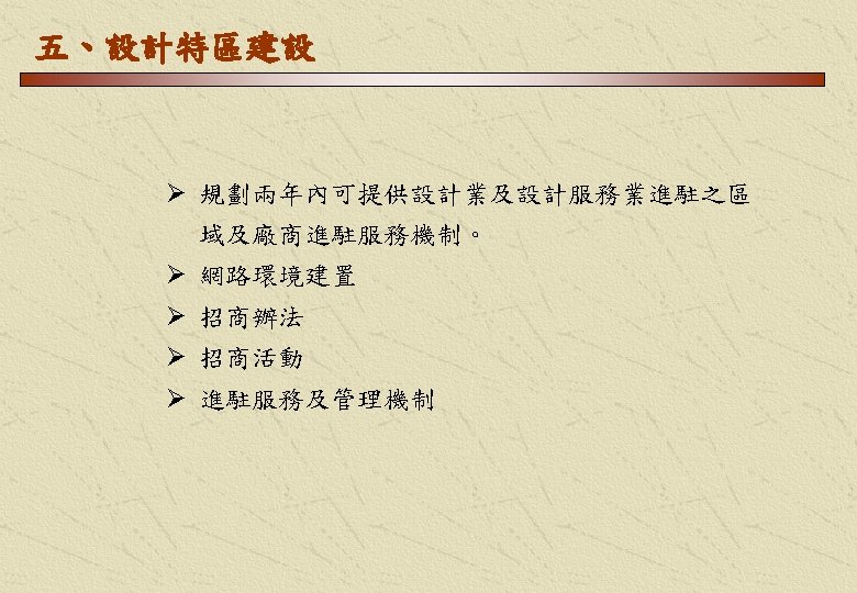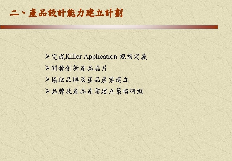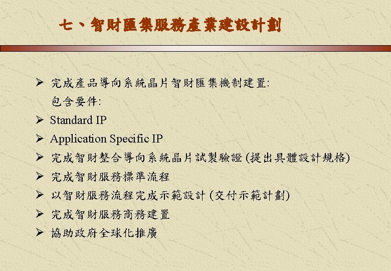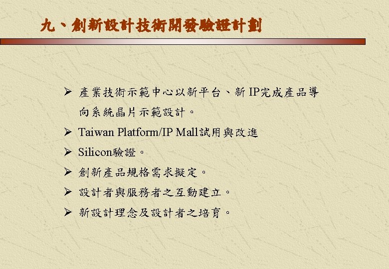 q完成足以提供 3 C及光電產品導向系統 晶片設計之智財匯集機制建置 q完成智財整合系統晶片試製驗證 12 F IP Services 11 F IP Services q完成智財服務標準流程