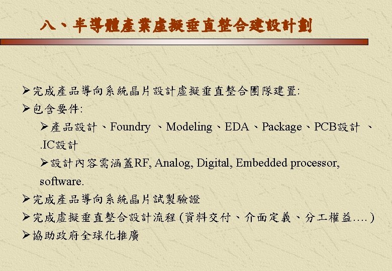 80% Design Houses, Product Houses 設計環境 (平台服務) 製造環境: Foundry, Testing, package, PCB, Modeling System