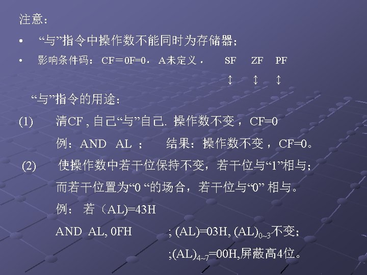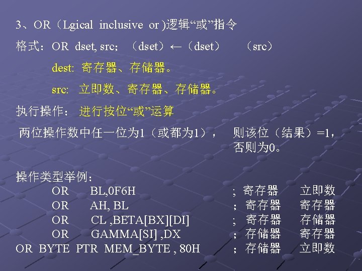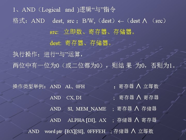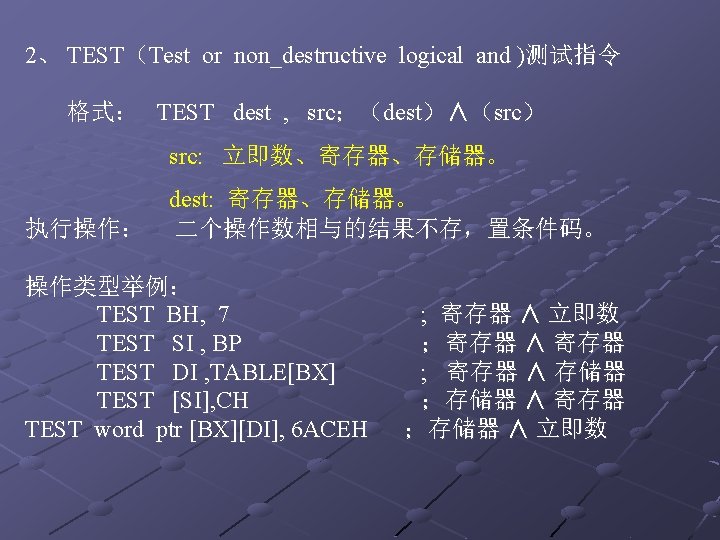 80888 1 4 SHL SHR SAL SAR 1 Slides: 55 Download presentation (二)移位指令 (8088有8条移位指令) : 1、 算逻移位指令( 4条 ): SHL , SHR, SAL , SAR 。 (1)、 SHL/SAL(Shift logical left/shift arithmetic left) 逻辑左移/算术左移指令 (2)、SHR (Shift logical right ) 逻辑右移指令 (3)、SAR (Shift arithmetic right )算术右移指令 2、循环移位( 4条): ROL, ROR , RCL, RCR。 (1)、ROL (Rotate left ) 不含CF循环左移指令 (2)、ROR (Rotate right ) 不含CF循环右移指令 (3)、RCL (Rotate left through carry )含CF循环左移指令 (4)、RCR (Rotate right through carry )含CF循环右移指令 应用举例: (BX)=84 F 0 H (1) 若(BX)无符号数,求(BX)/2 SHR BX,1 ; (BX)=4278 CF=0,OF=1,SF=0,ZF=0 (2) 若(BX)带符号数,求(BX)/4 MOV CL,02 H 或SAR BX,1 SAR BX,CL SAR BX,1 ; CF=0,OF无意义, SF=1,ZF=0 (一) 与REP相配合 作的MOVS、STOS、LODS指令 • REP 重复串操作直到(CX)=0为止 格式:REP String Primitive 串指令 String Primitive 可为:MOVS、STOS、LODS。 1. MOVS(Move String) 2. LODS(Load from String) 串传送 从串取指令 3. STOS(Store into String) 存入串指令 例:将内存的数据段中以AREA 1为首地址的100个数据,传 送到附加段中的AREA 2为首地址的区域。 用MOVS串操作指令编程: MOV AX,SEG AREA 1 MOV DS,AX MOV AX,SEG AREA 2 MOV ES,AX MOV SI,OFFSET AREA 1 MOV DI,OFFSET AREA 2 MOV CX,100 CLD ; DF=0,增址传送 REP MOVS ES:BYTE PTR[DI], DS:[SI] 应用MOV指令编程: MOV AX,SEG AREA 1 MOV DS,AX MOV AX,SEG AREA 2 MOV ES,AX MOV SI,OFFSET AREA 1 ;将ARE 1偏移地址→SI MOV DI,OFFSET AREA 2 MOV CX,100 LOOP 1:MOV AL,[SI] ; (AL)←((DS):(SI)) MOV ES:[DI],AL ;((ES):(DI))←(AL) INC SI INC DI DEC CX JNE LOOP 1 例:在附加段STORE开始存 5个空格 . . . STORE: 程序: 20 H MOV AL,20 H ;‘ ’ (AL) 20 H MOV CX,5 MOV DI,offset STORE 20 H. . . CLD REP STOSB ;((ES):(DI)) (AL) (DI)+1 . . . (二) 与REPE/REPZ和REPNE/REPNZ联合 作的CMPS和SCAS指令 • REPE/REPZ 当相等/为零时重复串操作 格式:REPE(或REPZ)string primitive 当相等重复前缀REPZ String primitive可为 : CMPS , SCAS 1、CMPS(Compare string ) 串比较指令 2、SCAS (Scan string ) 串扫描指令,搜索指令 • REPNE/REPNZ 当不相等/不为零时重复串操作 格式:REPNE(或REPNZ)string primitive 当不相等重复前缀REPNZ string primitive. String primitive可为 : CM PS , SCAS 1、CMPS(Compare string ) 串比较指令 2、SCAS (Scan string ) 串扫描指令,搜索指令 REPZ CMPSB指令 例:利用CMPS指令对STRING 1和STRING 2二个字符串进行 比较,相同在RESULT 单元送00 H,不同送0 FFH。 MOV SI,OFFSET STRING 1 MOV DI,OFFSET STRING 2 MOV CX,COUNT CLD REPZ CMPSB JNZ UNMAT ;若串不同,在RESUL单元中置 0 FFH MOV AL,0 ;若串相等,在RESULT单元中置 00 H JMP OULPT UNMAT:MOV AL,0 FFH OUTPT: MOV RESULT,AL HLT 开始 程序: 初始化,置源地址、目的地址指针 清方向标志DF LEA SI , BLOCK 1 LEA DI , BLOCK 2 CLD NEXT: LODSB CMP AL , 0 DH JZ DONE CMP AL , 61 H JC OK CMP AL , 7 BH JNC OK SUB AL , 20 H OK: STOSB JMP NEXT DONE: HLT 取一个字符 Y 回车? N Y <‘a' N Y >'z'? N 转换为大写字母 送存 流程图 结束