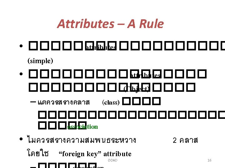 Difference between attributes and associations • Conceptual perspective – ��������� – Attributes ������ (single-valued) • Specification/implementation perspective – Attribute ������� (Value) �������� (References) • ไมมการ share ������� attribute values ����� instances �������� OOAD 51