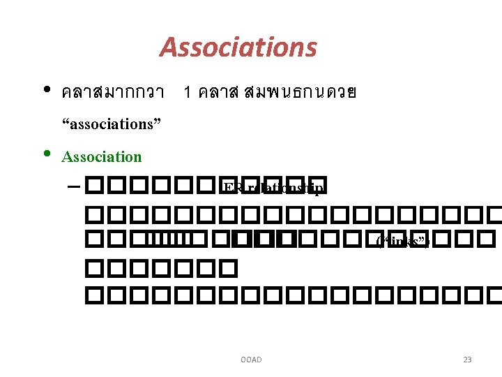 Association • ความสมพนธ ��� classes (Relationship) ������� instances association name direction Order date. Received is. Prepaid number : String * price : Money Customer issued by 1 dispatch( ) Customer may make several orders name address credit. Rating( ) Order comes from one customer OOAD 22