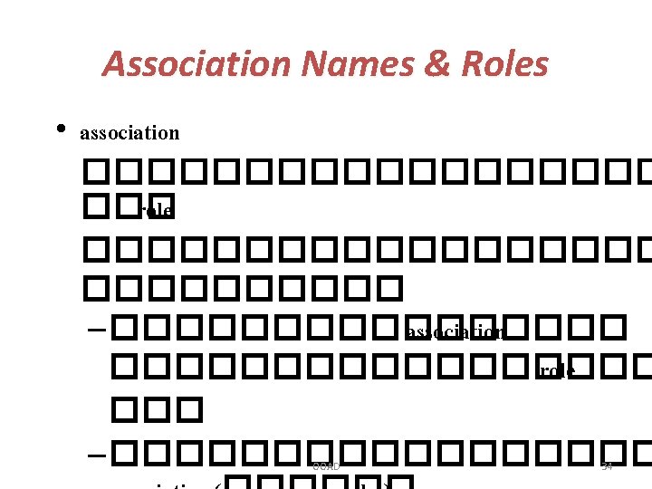 Summary: Basic notation for associations Class A mult 1 Association name role_B mult 2 role_A Class B • ������ Order 1 contains OOAD * line items Order Line 41
