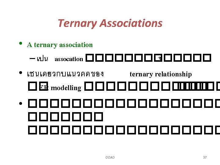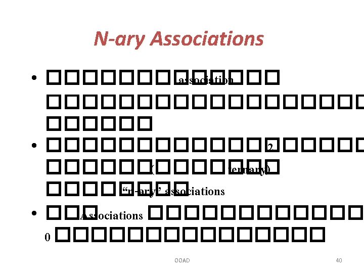 Ternary Association Multiplicity • multiplicity ��� ternary associations • ������ binary ��� unary associations • ������� “many” ��������� (participating) OOAD 39